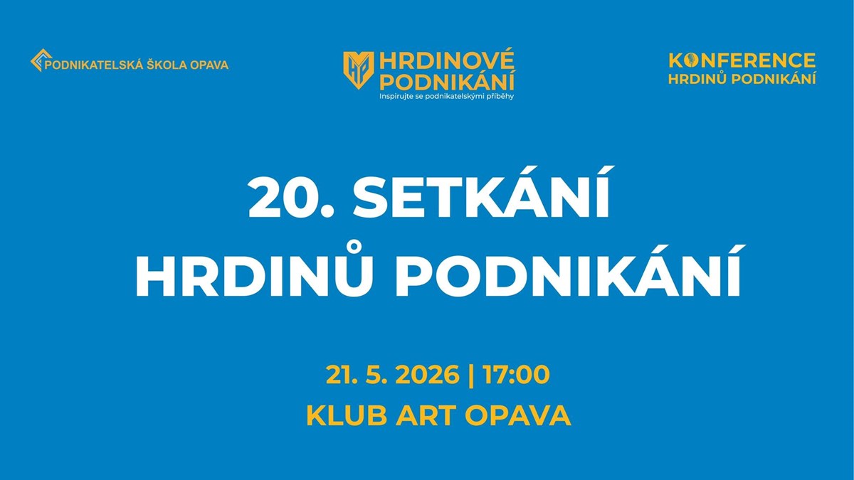 Příští setkání Hrdinů podnikání se uskuteční 21. května 2026, kdy vás čeká v pořadí již 20. setkání Hrdinů podnikání. Opět se můžete inspirovat příběhy 3 podnikatelů, poznat se a navzájem se propojit.Součástí setkání bude také networking, v rámci kterého můžete lépe poznat další podnikatele a lidi z okolí a případně navázat vzájemnou spolupráci.Ceník vstupenek:V online předprodeji: 100 KčNa místě konání akce: 150 KčStudenti/Senioři/ZTP: 50 Kč (v online předprodeji i na místě).Na místě konání akce si bude možné vstupenky zakoupit v hotovosti nebo platební kartou.Těší se na Vás celý náš tým Hrdinů podnikání