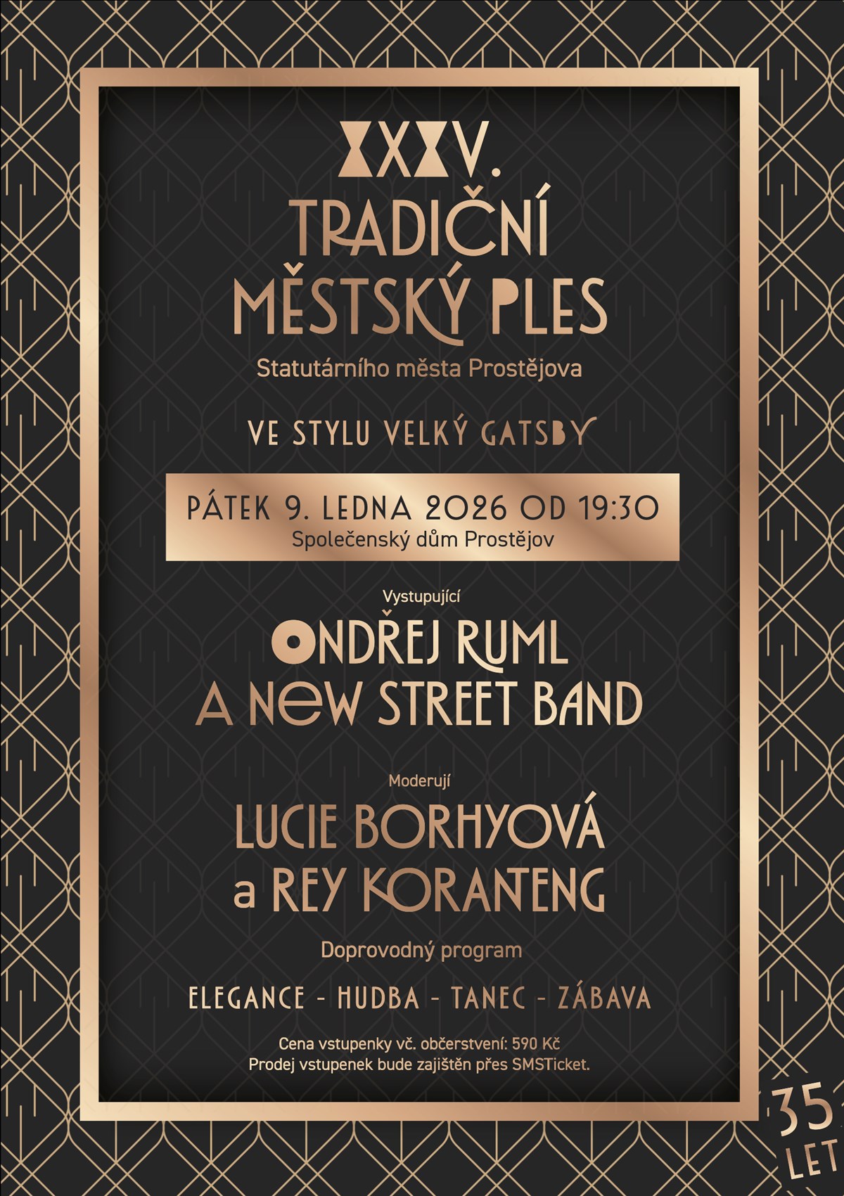 35. Tradiční městský ples Statutárního města Prostějovave stylu Velkého GatsbyhoPlesová sezóna v Prostějově odstartuje v pátek 9. ledna 2026! Čeká vás večer plný elegance, hudby, tance, zábavy a především oslava půlkulatého výročí tohoto prestižního plesu.Na parketu vás roztančí New Street Band s nestárnoucími jazzovými, swingovými, ale i moderními melodiemi. Kapela doprovodí také hlavního hosta večera - Ondřeje Rumla, výjimečného zpěváka s osobitým stylem a nezaměnitelným hlasem. Celým večerem vás provede oblíbená moderátorská dvojice Lucie Borhyová a Rey Koranteng. Doprovodný program nabídne originální taneční vystoupení v duchu Velkého Gatsbyho, ukázku rozverného Charlestonu, vystoupení Lidové muziky Frgál, fotokoutek, soutěž o ceny a mnoho dalšího. V ceně vstupenky je zahrnuto i občerstvení formou bohatého rautu. O závěrečnou afterparty se postará DJ Radio Haná.Odstartujte plesovou sezónu ve velkém stylu - ve stylu Velkého Gatsbyho!