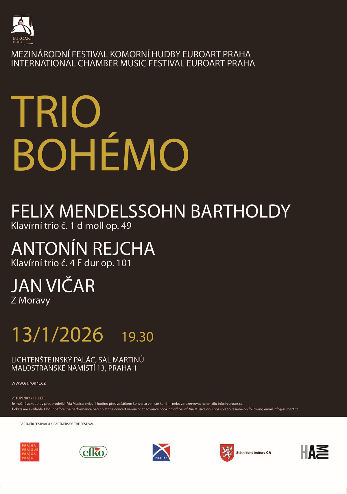 5. koncert festivalu EuroArt Praha13/1/2026 Lichtenštejnský palác, Sál Martinů, 19.30 hod Trio Bohémo Matouš Pěruška – housle Kristina Vocetková – violoncello Jan Vojtek – klavír Program:Felix Mendelssohn Bartholdy: Klavírní trio č. 1, d moll, op.49 Antonín Rejcha: Klavírní trio č. 4, F dur, op. 101 Jan Vičar: Z Moravy