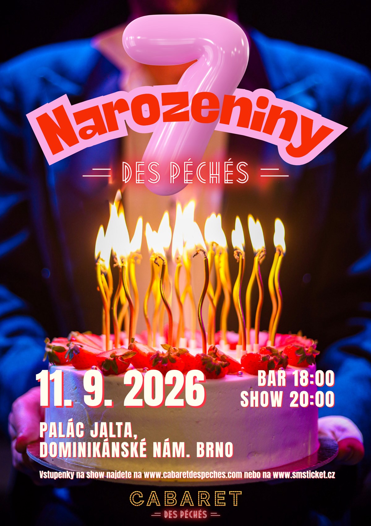 NAROZENINOVÁ SHOW V CABARETU Připravte se na další výjimečný večer, protože slavíme narozeniny ve velkém stylu! Čeká na Vás našlapaný program, který potrvá až do pozdních nočních – možná i ranních – hodin. Těšit se můžete na nabitý line-up plný energie a překvapení. Obsazení zveřejníme brzy.Vstupné:První dvě řady a boxy: 1399 Kč– v ceně welcome drink, kanapky a přípitekZbytek sálu: 1099 Kč– v ceně přípitekRezervace doporučujeme co nejdříve. Tento večer si nechcete nechat ujít. BIRTHDAY SHOW IN CABARETGet ready for another special evening, because we are celebrating birthdays in style! A packed program awaits you, which will last until late at night - maybe even the morning - hours. You can look forward to a busy line-up full of energy and surprises. We will announce the cast soon.Admission:First two rows and boxes: 1399 CZK- including welcome drink, canapes and a toastRest of the hall: 1099 CZK- including a toastWe recommend booking as soon as possible. You don't want to miss this evening.