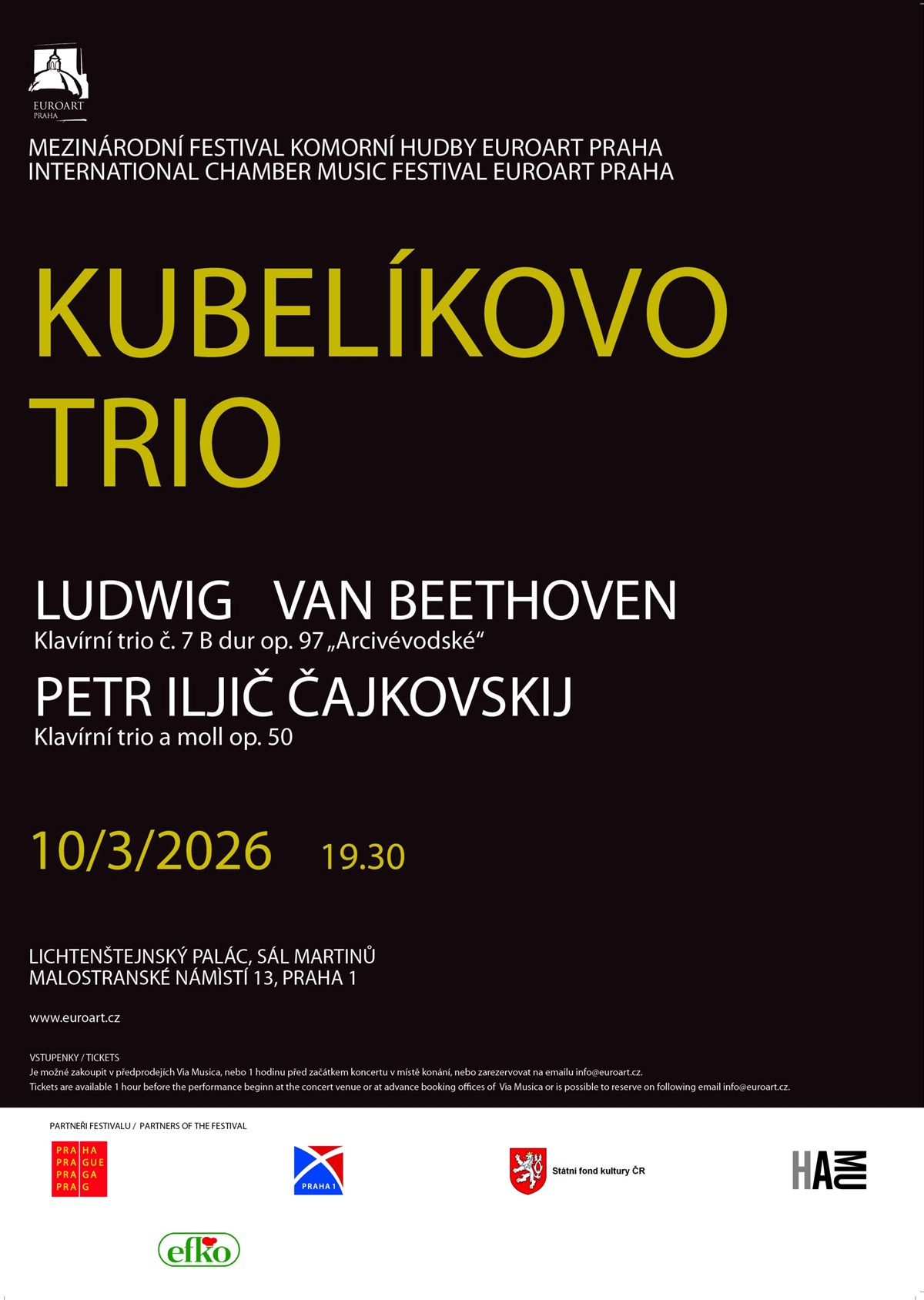 7. koncert festivalu EuroArt PrahaKubelíkovo trioShizuka Ishikawa – housle, JaponskoKartel Fiala – violoncelloLukáš Klánský - klavír Program:Ludwig van Beethoven: Klavírní trio VII B dur, op. 97 „Arcivévodské“ Petr Iljič Čajkovskij: Klavírní trio a moll, op.50