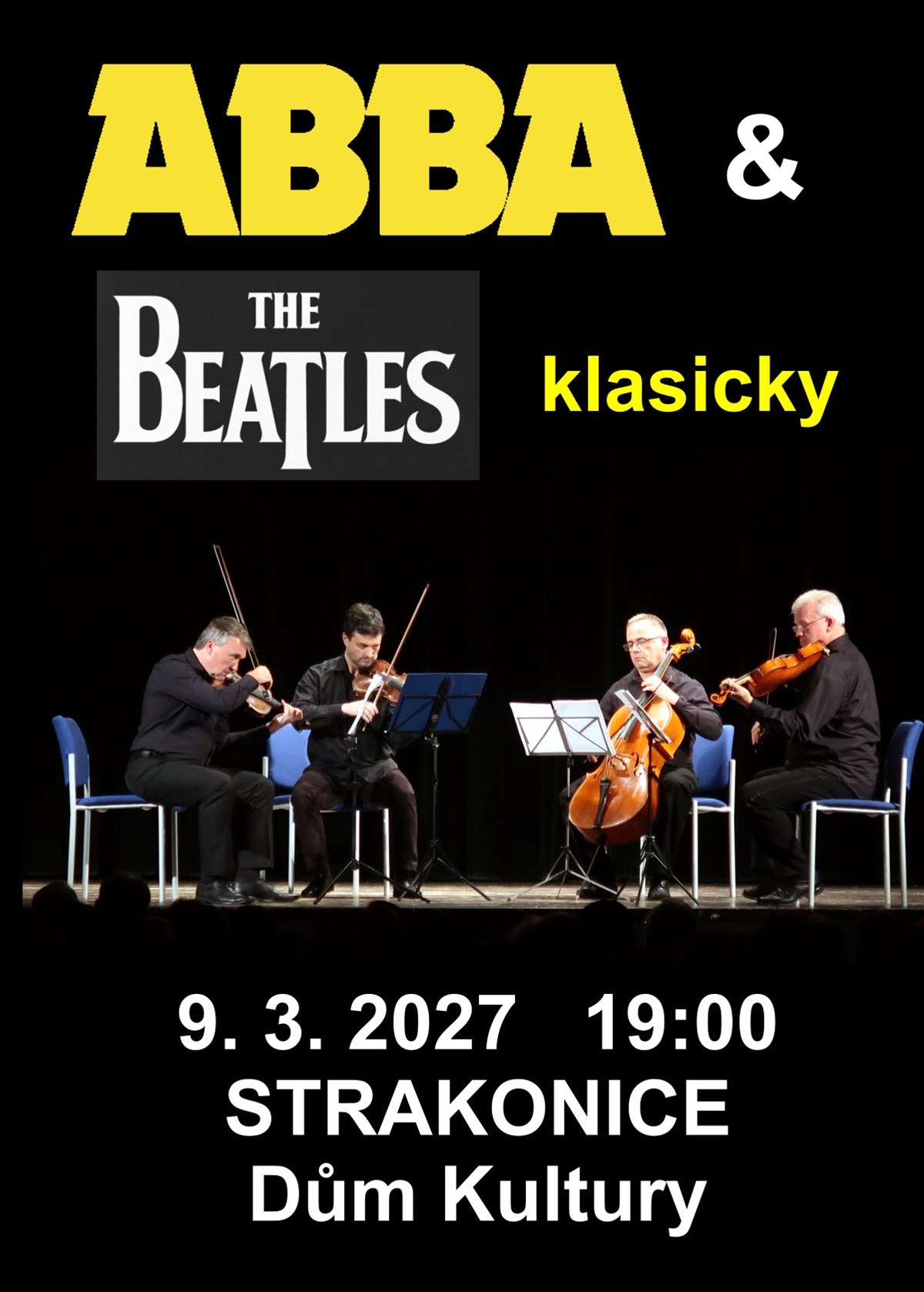 V Domě Kultury ve Strakonicích vás zve na krásný koncert plný hudby od světoznámých skupin ABBA a Beatles - aranží pro Klárovo smyčcové kvarteto, které zkomponoval pan Tom Klár. KLÁROVO KVARTETOPavel Hrda – I. housle, Bára Klárová - II. housle, Libor Kaňka – viola, Václav Fleissig – violoncello PROGRAM:BEATLES: ABBA: All you need is Love Dancing QueenObladi – oblada S.O.S.Yesterday WaterlooI want to hold your hand Super Trouper Hey, Jude FernandoFrom me to you Mamma miaShe loves you Money, money, moneyOh, darlingSomethingDizzy miss LizzyLady MadonnaA hard day´s NightDÉLKA cca 70 minut