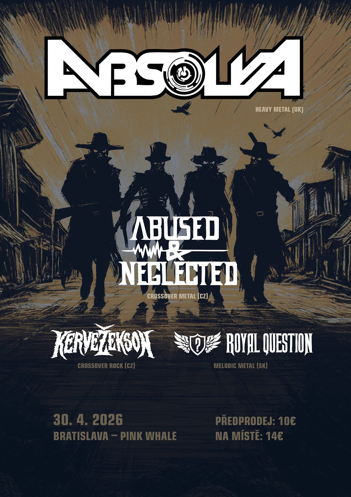 Heavy metalová stúpajúca hviezda Absolva (UK), ktorú môžete poznať ako súputníkov speváka Blaze Bayley vystúpi 30. 4. 2026 v Bratislave v Pink Whale. Spolu s ňou sa môžete tešiť na Abused & Neglected (modern heavy CZ), Kervežekson (crossover rock CZ) a Royal Question (melodic metal SK).Predpredaj: 10€ / na mieste 14€ Štart: 19:00 LINE-UP:19:30 - 20:00 Kervežekson (CZ)20:30 - 21:00 Royal Question (SK)21:30 - 22:00 Abused & Neglected (CZ)22:30 - 00:00 Absolva (UK)
