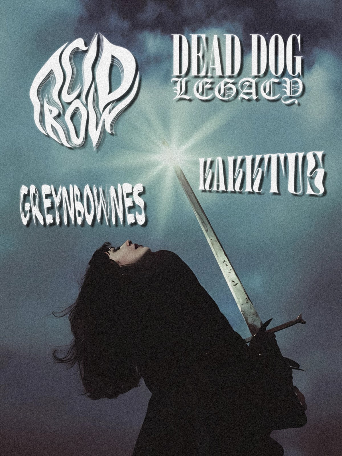 Koncert kapel ACID ROW, DEAD DOG LEGACY, KAKKTUS a GREYNBOWNES v olomouckém klubu HellPaso. ACID ROW:Acid Row lze poznat dle typické výbušné kombinace stoner rocku a punku, kořeněné prvky a ozvěnami doomu, psychedelického oparu, drásavého noise rocku či devadesátkového grunge. V současné době hrají Acid Row v sestavě Alex Fonar (zpěv, baskytara), Dominik Klesa (kytara) a Radek Bacík (bicí). Díky zásobě zuřivé energie projeli za léta na turné nejen Českou republiku, ale i část Evropy; cítí se jako doma v malých klubech, ovšem nezaleknou se ani velkých festivalových pódií. https://acidrow.bandcamp.com/___________________________________________________________DEAD DOG LEGACY:Hudba z Olomouce stavěna na kytarových žánrech s prvky elektroniky. Melancholická atmosféra a hra s tichem a hlukem patří k hlavním doménám nově vzniklé kapely v čele s Tommem Prochazkou, zpěvákem a kytaristou zaniklých Dirty Old Dogs. Kapela 𝐃𝐄𝐀𝐃 𝐃𝐎𝐆 𝐋𝐄𝐆𝐀𝐂𝐘 přichází se svým debutovým eponymním albem, které zachycuje klíčový moment zrodu – nejen nového hudebního projektu, ale především nové umělecké vize a osobního přístupu k tvorbě. https://linktr.ee/dead.dog.legacy___________________________________________________KAKKTUS:Ponurý, energický rokenrol, trochu blues, hodně punk. Kapela původem z podzemí moravského Šternberka. České texty, písničkářský country vibe. Existenciální poetika města a s ním spojené příběhy a postavy, které ožívají v osobně laděných, autentických textech. Právě dokončují novou desku, ze které dají určitě leccos ochutnat.https://kakktus.bandcamp.com/___________________________________________________GREYNBOWNES:Trio Greynbownes je železobeton protkaný sny. Nejdůležitější je tu riff, atmosféra a syrovost, kdy je stoner rock jejich mama a dark blues snoubící se s psychadelií jejich tata.http://greynbownes.bandcamp.com/