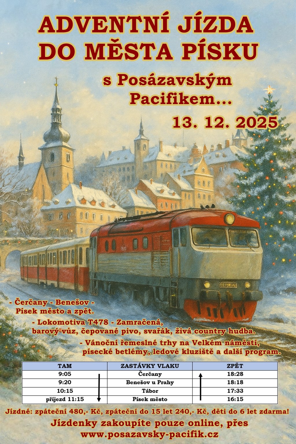VÁNOČNÍ EXPRES POSÁZAVSKÉHO PACIFIKU, Z ČERČAN A BENEŠOVA U PRAHY, DO HISTORICKÉHO MĚSTA PÍSKU.Vlak je veden historickou motorovou lokomotivou T478 - "Zamračená".Ve vlaku je řazen bufetový vůz s čepovaným pivem, svařákem a dalším občerstvením - cestu zpříjemní i živá country hudba!Ve vlaku je řazen vůz pro přepravu kočárků.Adventní řemeslné trhy, tradiční písecké betlémy, v provozu veřejné kluziště na náměstí a mnoho dalšího.