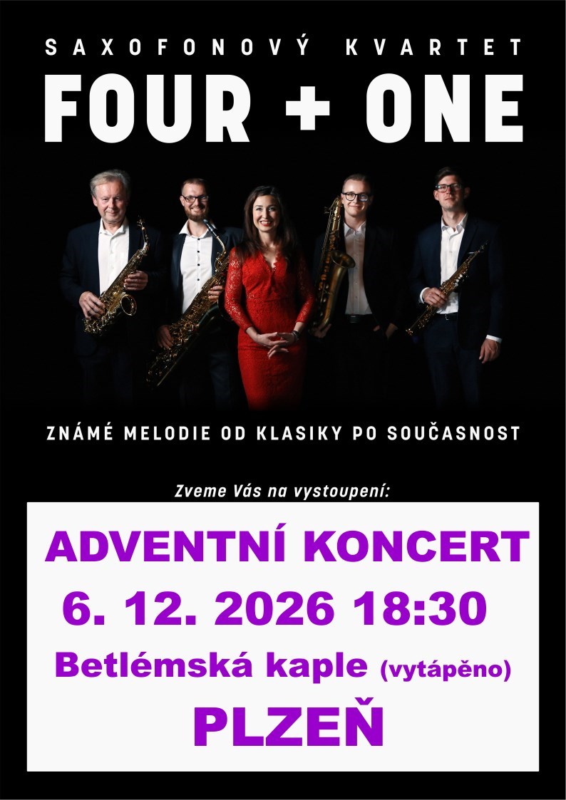 Pojďte si užít zbrusu nový program pro 4 saxofony a zpěv v dramaturgicky pestrém adventním koncertu od klasiky, přes swing a jazz až k moderní hudbě, včetně aranží známých koled do vytápěného nádherného funcionalistického sálu plzeňské Betlémské kapleSaxofonové kvarteto FOUR + ONEPetr RANDÍK – soprán saxofon, Zdeněk ZADRAŽIL – alt saxofon,Tomáš PUDIVÍTR – tenor saxofon, Vít DĚDIČ – baryton saxofona Andrea KAŇKOVÁ - zpěvPROGRAM:A. MICHNA Z OTRADOVIC - Nebeští kavalérovéM. A. CHARPENTIER - Te Deum F. SCHUBERT - AVE MARIA J. ŠLITR - PURPURA J. S. BACH - Aria, Marcia, Musetta J. F. WADE - ADESTE FIDELES R. BINGE - Alžbětínská serenáda F. GRUBER - Tichá noctraditional - The first nowell I. BERLIN - White Christmas směs koled L. COHEN - Hallelujah G. MARTINI - Celebre Gavotta J. STRAUSS - Pizzicato PolkaRolničky Už z hor zní zvonW. HOUSTON - I will always love you Cingiling Šťastné Vánoce změna programu a účinkujících vyhrazena, délka cca 65 minut