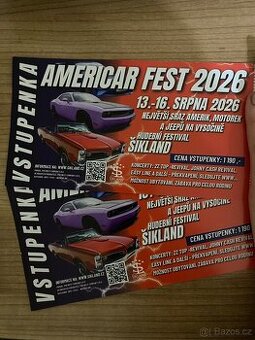 Prodám dvě vstupenky na Americar fest 2026, který se koná 13.-16.8. 2026. v Šiklandu. Cena za obě vstupenky 2000,- Platba předem na účet, ihned odesílám. V případě zájmu mě kontaktujte prostřednictvím mailu (formuláře níže).