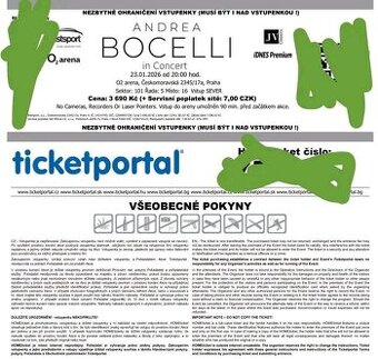 Nabízím dva originální vstupní lístky na koncert Andrea Bocelli – In Concert, který se uskuteční 23. 1. 2026 od 20:00 v O2 areně Praha.