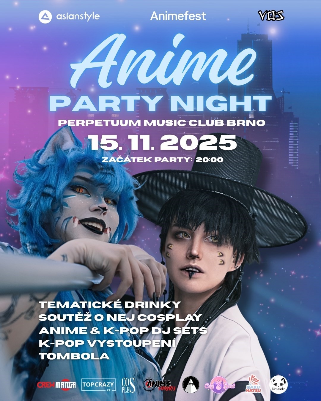Derpie a Sussy spojují síly s Asianstyle, Animefest a VOS, aby vám přinesly noc plnou anime a k-pop atmosféry, skvělé hudby, k-pop vystoupení, tomboly a epických cosplayů! Kdy: 15. 11. 2025 (začátek party 20:00, konec party 3:00) Kde: Perpetuum Music Club (Rooseveltova 1/2, Brno) Vstup: 180 Kč v předprodeji / 200 Kč na místěTěšíme se vás na naší první společné Anime Party Night!