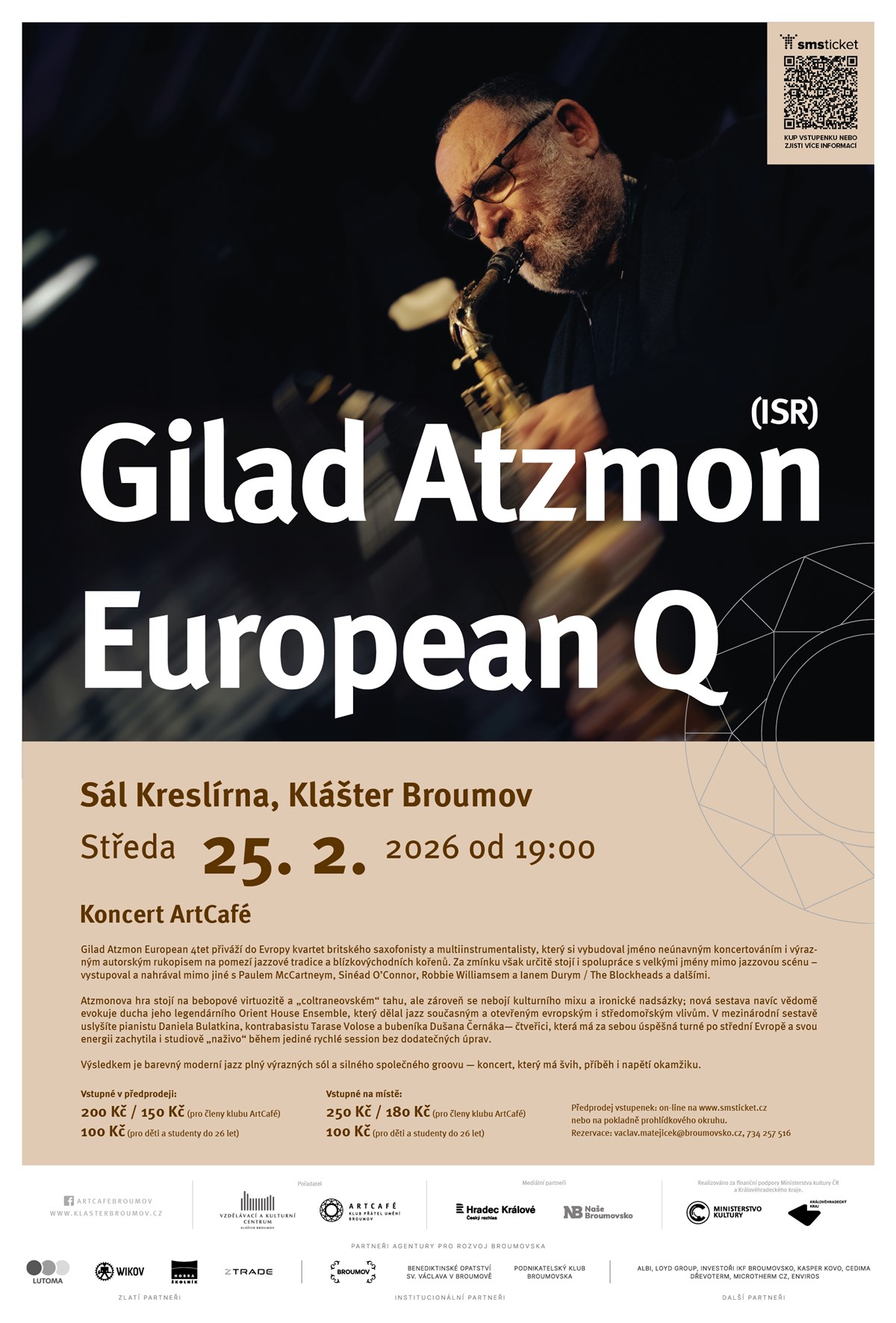 Gilad Atzmon European 4tet přiváží do Evropy kvartet britského saxofonisty a multiinstrumentalisty (saxofony, klarinet i etnické dřevěné nástroje), který si vybudoval jméno neúnavným koncertováním i výrazným autorským rukopisem na pomezí jazzové tradice a blízkovýchodních kořenů. Za zmínku však určitě stojí i spolupráce s velkými jmény mimo jazzovou scénu – vystupoval a nahrával mimo jiné s Paulem McCartneym, Sinéad O’Connor, Robbie Williamsem a Ianem Durym / The Blockheads a dalšími.Atzmonova hra stojí na bebopové virtuozitě a „coltraneovském“ tahu, ale zároveň se nebojí kulturního mixu a ironické nadsázky; nová sestava navíc vědomě evokuje ducha jeho legendárního Orient House Ensemble, který dělal jazz současným a otevřeným evropským i středomořským vlivům. V mezinárodní sestavě uslyšíte pianistu Daniela Bulatkina, kontrabasistu Tarase Volose a bubeníka Dušana Černáka— čtveřici, která má za sebou úspěšná turné po střední Evropě a svou energii zachytila i studiově „naživo“ během jediné rychlé session bez dodatečných úprav. Výsledkem je barevný moderní jazz plný výrazných sól a silného společného groovu — koncert, který má švih, příběh i napětí okamžiku.