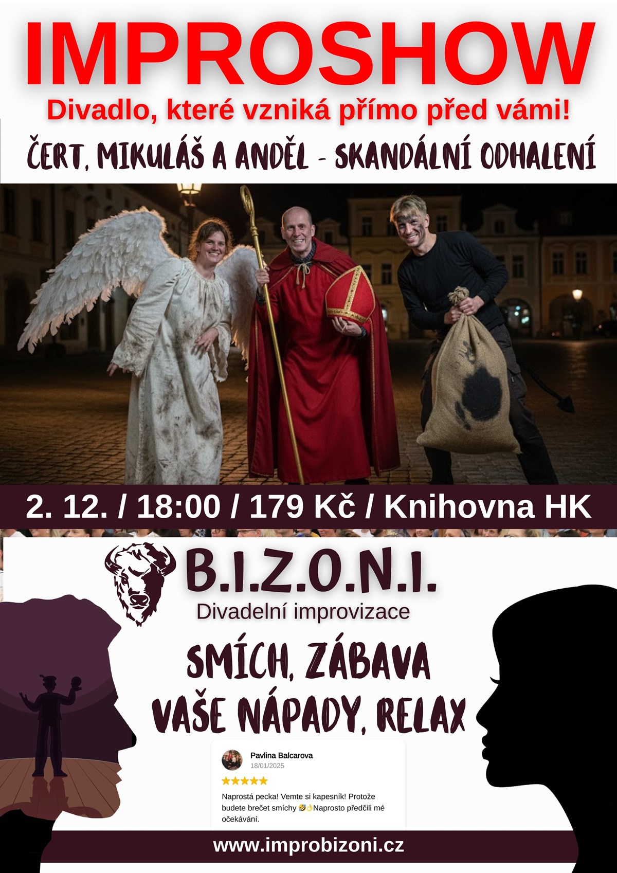 🔥 ČERT, MIKULÁŠ A ANDĚL: SKANDÁLNÍ ODHALENÍ! 🔥IMPROVIZACE B.I.Z.O.N.I. – Tuto show neuvidíte nikde jinde!Nečekejte na 200 Kč na místě! Lístky na toto pikantní předvánoční odhalení už teď mizí a zájem neustále roste. Zajistěte si své místo předem a užijte si jedinečný, garantovaný zážitek bez stresu.Co se skrývá za fasádou svatosti a pekelných tajemství? Zapomeňte na tradiční pohádku! Naši tři hrdinové — unavení, frustrovaní a možná i trochu zlí — odhalí, jak to skutečně chodí v nebeské a pekelné byrokracii. Čeká vás improshow plná černého humoru, šokujících zvratů a témat, která by se na vánoční besídce hrát neměla.Proč přijít?Téma, které baví: Využijeme aktuální atmosféru a obrátíme ji naruby.Garantovaný Humor: Zaručujeme smích při pohledu na unavenou trojici, která ztratila iluze.Sociální Důkaz: Přečtěte si, proč se k nám lidé neustále vrací (recenze).Jak to funguje?Vy jako diváci navrhnete témata, místa, postavy nebo situace a naši herci okamžitě vytvoří zábavné a originální scénky. Vaše fantazie a naše "skandální" trojice určují směr představení!Co vás čeká?Neopakovatelnost: Vždy originální a unikátní show!Jistota místa: V předprodeji máte vstup bez čekání a rizika vyprodání.Humor pro každého: Od vtipných dialogů po absurdní situace.Praktické informaceMísto: Knihovna Hradec KrálovéDélka: cca 90 minutVhodnost: 12+Vstupné: 179 Kč v předprodeji / 200 Kč na místě / 150 Kč studentské (pouze s platným dokladem na místě)Interaktivita: Možnost zapojení publika (dobrovolně)Užijte si večer plný nečekaných odhalení a smíchu. Klikněte Koupit, zajistěte si místo v sále a uvidíme se 2. prosince!