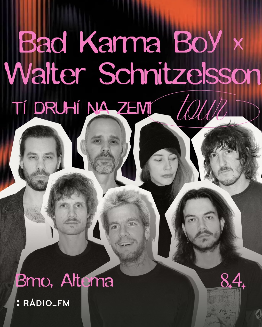 „Je to pro nás přirozené spojení.“ Walter Schnitzelsson a Bad Karma Boy spojují síly na česko-slovenském turné 2026Dvě výrazná jména alternativní hudební scény se na jaře 2026 setkají na jednom pódiu. Walter Schnitzelsson a Bad Karma Boy vyrážejí na společné česko-slovenské turné Tí druhí na Zemi, které nebude jen sérií koncertů, ale promyšleným hudebním dialogem dvou kapel, které se dlouhodobě pohybují ve stejném hodnotovém prostoru – autenticita, silné texty a generační výpověď. Za fotografie a vizuál k turné vděčí Viktorovi Cickovi.Pro Walter Schnitzelsson je turné přirozeným pokračováním alba Tí druhí, kterým kapela poprvé představuje svou tvorbu ve slovenštině. Nové skladby pracují se syrovým kytarovým zvukem, indie melodikou a punkovou energií, zároveň však přinášejí citlivou a osobní výpověď. „Na tomto albu jsme se rozhodli mluvit o tom, co prožíváme tady a teď. Písničky jsou o nervech, rozchodech, společenské únavě, ale i o nadhledu a radosti ze života. Je to takový mix reality třicátníků. Nějaká energie nám však zůstala,“ říká frontman Jozef Rezník. Právě tuto energii chtějí přenést do koncertní podoby – ještě přímočařeji, hlučněji a intenzivněji.Bad Karma Boy přivezou na turné album Noc Na Zemi. To vznikalo mezi Bratislavou a Kostarikou a nese v sobě atmosféru míst, nočních rozhovorů a vypráví o samotě i blízkosti. Zachycuje momenty, které se dějí potichu, ale zanechávají silnou stopu na dlouhou dobu. Naživo skladby zaujmou elektronickými detaily, volně dýchajícími písněmi a vrstvenými aranžemi.Společné turné tak vytvoří dynamický oblouk večera – od kytarové dravosti po zasněné alt-popové plochy. „Vnímám to jako něco velmi pozitivního, bude to barevné, široký rozptyl emocí i hlasitosti, dobře to do sebe zapadá,“ popisují dramaturgii večerů Bad Karma Boy. Kapely chystají také překvapení v podobě společných momentů na pódiu a premiéry nových, dosud nevydaných skladeb. Koncerty pro ně budou přirozeným spojením, protože se znají dlouhá léta a v minulosti už spolupracovali. „To je výhoda společného turné s lidmi, které znáte už strašně dlouho,“ dodávají Walter Schnitzelsson.Důležitou součástí je i výběr prostor. Koncerty se budou odehrávat na místech s charakterem, kde je kontakt s publikem bezprostřední a impulzivní. Turné Tí druhí na Zemi odstartuje 3. dubna 2026 v Tabačka Kulturfabrik v Košicích, pokračuje 4. dubna v Záhrada – Centrum nezávislé kultury v Banské Bystrici, 7. dubna se přesune do Café V lese v Praze a 8. dubna do klubu Alterna v Brně. Slovenské finále bude patřit 17. dubna v bratislavském DK Zrkadlový háj a 18. dubna v prostoru Malý Berlín v Trnavě. „Tam jsme ještě nehráli s novým albem a bude to i naše premiéra v Malém Berlíně,“ speciálně zmiňují trnavskou zastávku členové kapely Bad Karma Boy.Turné tak propojí dvě generace fanoušků, dva přístupy k psaní skladeb a dva způsoby, jak mluvit o současnosti – jednou přímo, jindy poeticky, ale vždy upřímně a od srdce. Jaro 2026 přinese sérii večerů, které budou víc než jen koncertem. Budou setkáním, výměnou energie a společným sdílením příběhů, které se dějí „tady a teď“.