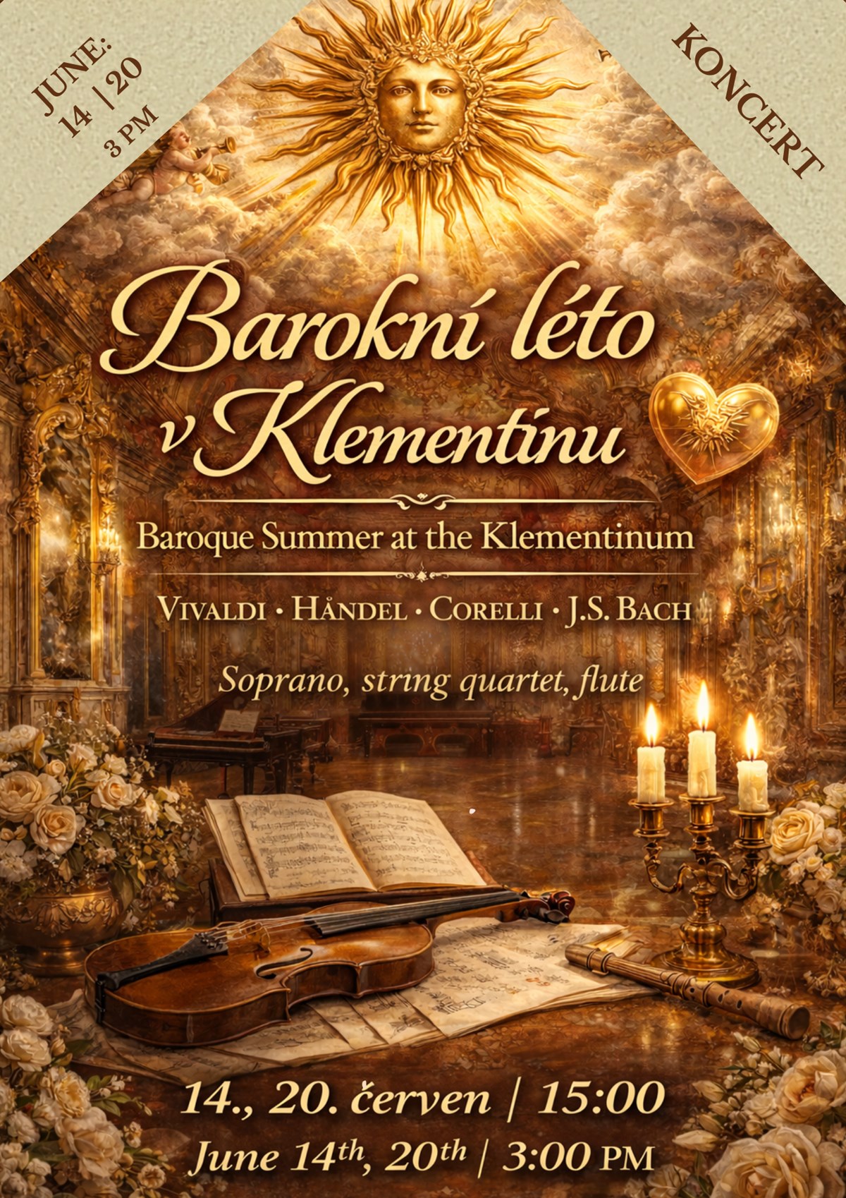 Koncert Barokní léto v KlementinuDopřejte si kouzelný letní podvečer v jednom z nejkrásnějších barokních sálů historické Prahy – v okouzlující Zrcadlové kapli Klementina.V atmosféře zlacených fresek, světla svící a jedinečné akustiky zazní hudba barokních mistrů, která dodnes fascinuje svou krásou, energií i hloubkou.Na koncertě vystoupí houslový virtuóz a vyjímečná sopranistka za doprovodu smyčcového kvartetu, kteří společně oživí hudební poklady autorů jako Vivaldi, Händel, Biber, Michna z Otradovic a dalších.Nechte se unést do světa barokní elegance, kde hudba, historie a letní atmosféra Prahy vytvářejí nezapomenutelný zážitek.✨ Hudba, která rozzáří letní den v srdci staré Prahy.youtu.be/zYpK9OsUvH0?si=eBy3myAUG81BHjLj Baroque Summer at the KlementinumTreat yourself to a magical summer afternoon in one of the most beautiful Baroque halls of historic Prague – the enchanting Mirror Chapel of the Klementinum.In the atmosphere of gilded frescoes, candlelight, and extraordinary acoustics, you will hear the music of Baroque masters whose works continue to captivate audiences with their beauty, brilliance, and emotional depth.The concert will feature outstanding soloists – a violin virtuoso and a charming soprano, accompanied by a string quartet.The program includes music by great Baroque composers such as Vivaldi, Handel, Biber, Michna of Otradovice, and others.Let yourself be transported into the world of Baroque elegance, where music, history, and the summer atmosphere of Prague come together to create an unforgettable experience.✨ Music that will illuminate a summer day in the heart of old Prague.youtu.be/zYpK9OsUvH0?si=eBy3myAUG81BHjLj
