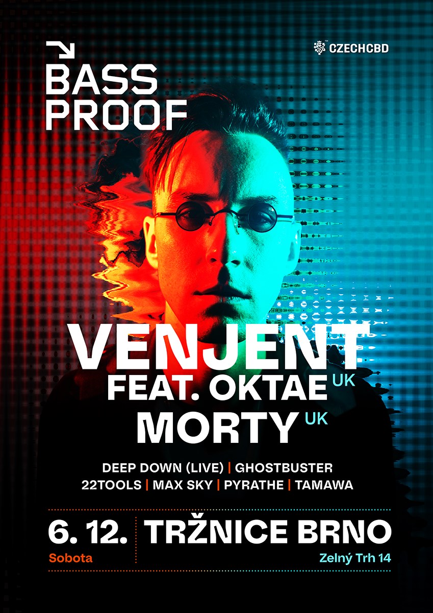 BASSPROOF: VENJENT (UK) FEAT. OKTAE & MORTY Pátek 6.12. 2025 | Tržnice Brno | Start 21:00Bassproof se vrací do brněnské Tržnice! A jako minule – i tentokrát to bude absolutní drum & bass bomba! Připrav se na pořádnou explozi D’n’B! Z UK přijíždí VENJENT, šílený experimentátor, který dokáže proměnit v D’n’B banger cokoli – od vrzání dveří až po řev racka. Společně s ním dorazí OKTAE, která Venjenta doprovodí svým vokálem, a MORTY, jenž představí vlastní D’n’B sound přímo z britských ostrovů! A to není všechno – speciální live act přinese Deep Down, která svým houslovým setem posune celou noc na úplně jiný level. Lokální support zajistí brněnská DnB sestava: Ghostbuster, 22Tools, Max Sky, Pyrathe a Tamawa – ready to roll až do ranních hodin! BASSPROOF: VENJENT (UK) FEAT. OKTAE & MORTY Venjent feat. Oktae (UK)Morty (UK)Deep Down (DnB Violinist live)Ghostbuster22toolsMax SkyPyratheTamawa********************************************************************************* Kdy / When: 06.12.2025 Kde / Where: Tržnice Brno - Zelný trh 14 - Brno Centrum Start / Start: 21:00 h Konec / End: 05:00 h Vstup / Entry: 320/400 Kč Warm up: 22.11.2025 - club Perpetuum - Brno Afterparty: 07.12.2025 - od 05:00 club Perpetuum - Brno*********************************************************************************#brno #dnb #drumandbass #neurofunk #rave #klub #bassproof #venjent #brno