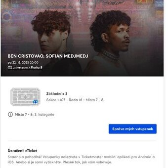 Predám 2x sezení vedla seba na Bena, 22.12.2025 v Prahe Sektor: 107 Sekce 1-107 • Řada 16 • Místa 7 - 8 cena: 4400czk spolu