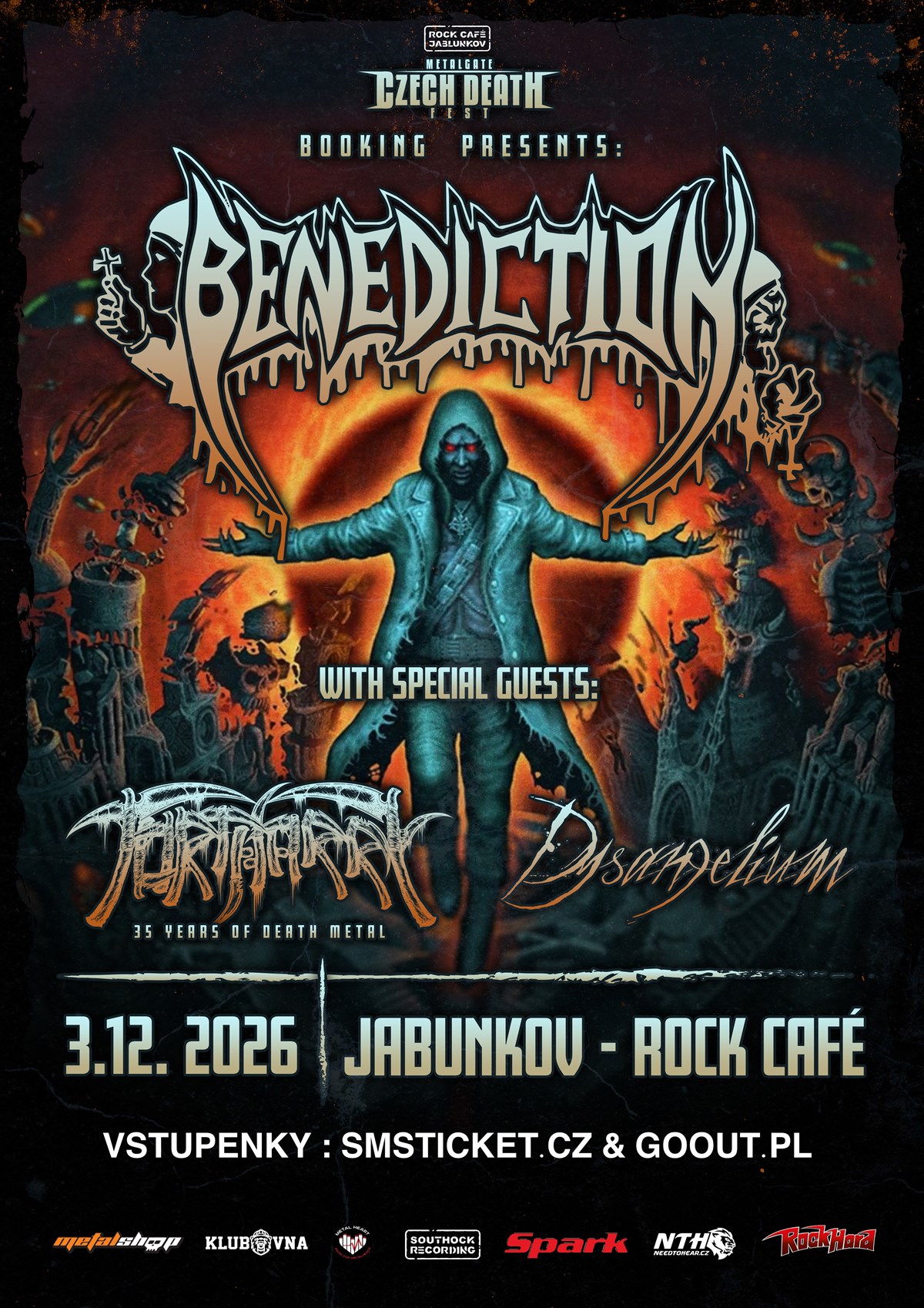 Legendy britského death metalu, které stojí u samotných kořenů žánru. Benediction vznikli v Birminghamu roku 1989 a jejich debut Subconscious Terror (1990) okamžitě upoutal pozornost světa. Kultovní album Transcend the Rubicon (1993) je dodnes považováno za jeden z pilířů evropského death metalu. S návratem zpěváka Davea Ingrama vydali v roce 2020 comeback album Scriptures, které ve Německu vstoupilo na úžasné #11 oficiálních hitparád — výjimečný výsledek pro old-school death metal. Jejich nejnovější deska Ravage of Empires (2025) potvrzuje, že Benediction hrají na nejvyšší světové úrovni. Vystupují na Wacken Open Air, Maryland Deathfest — a teď přijíždějí do Jablunkova. Česká death metalová instituce. Od roku 1991 budují Tortharry z Hronova neochvějnou reputaci jedné z nejdůslednějších a nejvlivnějších domácích death metalových kapel. Za třicet let existence vydali sérii zásadních desek — od brutálních počátků přes komplexnější alba jako Unseen, Beneath nebo Altars of Ignorance až po nedávné Paměť kamenů (2024), jejich první album zcela v češtině. Silné živé vystoupení s precizní produkcí — přesně to, co death metal musí být. Domácí death metalová síla s ostrými drápy. Dysangelium od roku 2011 budují pověst jedné z nejintenzivnějších živých kapel české extreme metalové scény. Za sebou mají vystoupení na Brutal Assault, Czech Death Fest nebo slovenském Gothoom Festival, evropská turné a sdílení pódia s ikonami jako Destruction, Rotting Christ nebo Skeletal Remains. Jejich nejnovější album Jonestown (2024) dokazuje, že mají stále co říct!