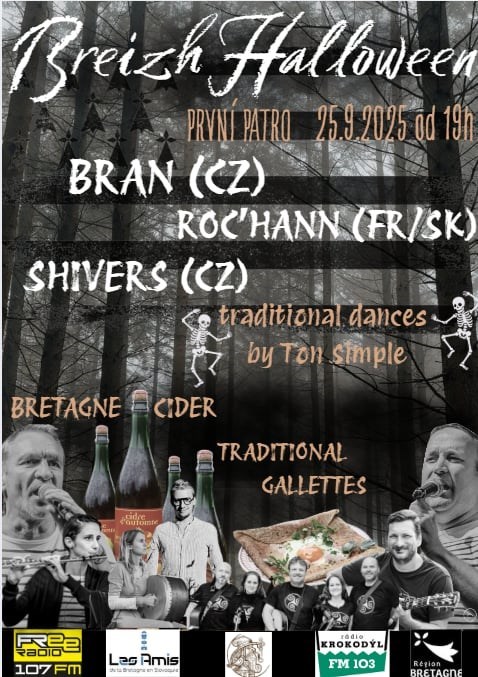 Po roce je zpátky večer plný bretaňské hudby, kultury, jídla, pití a tance! Tentokrát s lehce halloweenskou atmosférou, jelikož se blíží svátek Samhain, který měl ve staré Bretani veliký význam.Předvedou se famózní a legendární BRAN, kteří dotáhnou zbrusu novou desku, dál francouzsko-slovenská legenda ROC’HANN, kteří nedávno oslavili 20 let na scéně, a čeští SHIVERS se svou keltskou muzikou!O výuku bretaňských tanců se postará skupina Ton Simple, kteří jsou jednička v tomhle oboru, a jejich ladné tanečné kroky ste mohli vidět již na mnoha našich akcích!Na akci bude možnost ochutnat pravý BRETAŇSKÝ CIDER a tradiční BRETAŇSKÉ GALETY (neboli bretaňské palačinky), proběhne workshop bretaňských tanců, povídání o staré Bretani, druidech a jejich propojení se svátkem Samhain.Přijďte s námi opět zažít nezapomenutelný večer plný magie, muziky, dobrého jídla a nápojů, tance a zábavy!Již 25. 10. v klubu První Patro! Line up:18:00 otevření klubu, prodej cideru a jídla19:00 Shivers20:00 Výuka tanců20:30 Roc'hann22:00 Přednáška "Bretaň a Halloween"22:15 Výuka tanců22:40 BRAN --------------------------------------------------------------Fête de la Bretagne, soirée de musique, cidre, repas et dances bretonnes! Cette fois avec la thème de Halloween, car la date de soirée est tout près de Samain, la fête très importante pour les Celtes, les ancêtres des Bretons.Qu'est-ce qu'on va vous présenter dans le soirée? Il y aura les performances des groupes de musique bretonne et celtique, comme BRAN (CZ), Roc'hann (FR/SK) et Shivers (CZ). En suite nous vous invitons à goûter les gallettes et le cidre, tout original breton! Il y aura les leçons des dances bretonnes, vous pouvez particier à presentation sur les druids et leur connection avec la fête Samain (Halloween).Soyez invités à célébrer la Bretagne avec nous le 25.10. dans le club de musique První Patro à Brno!