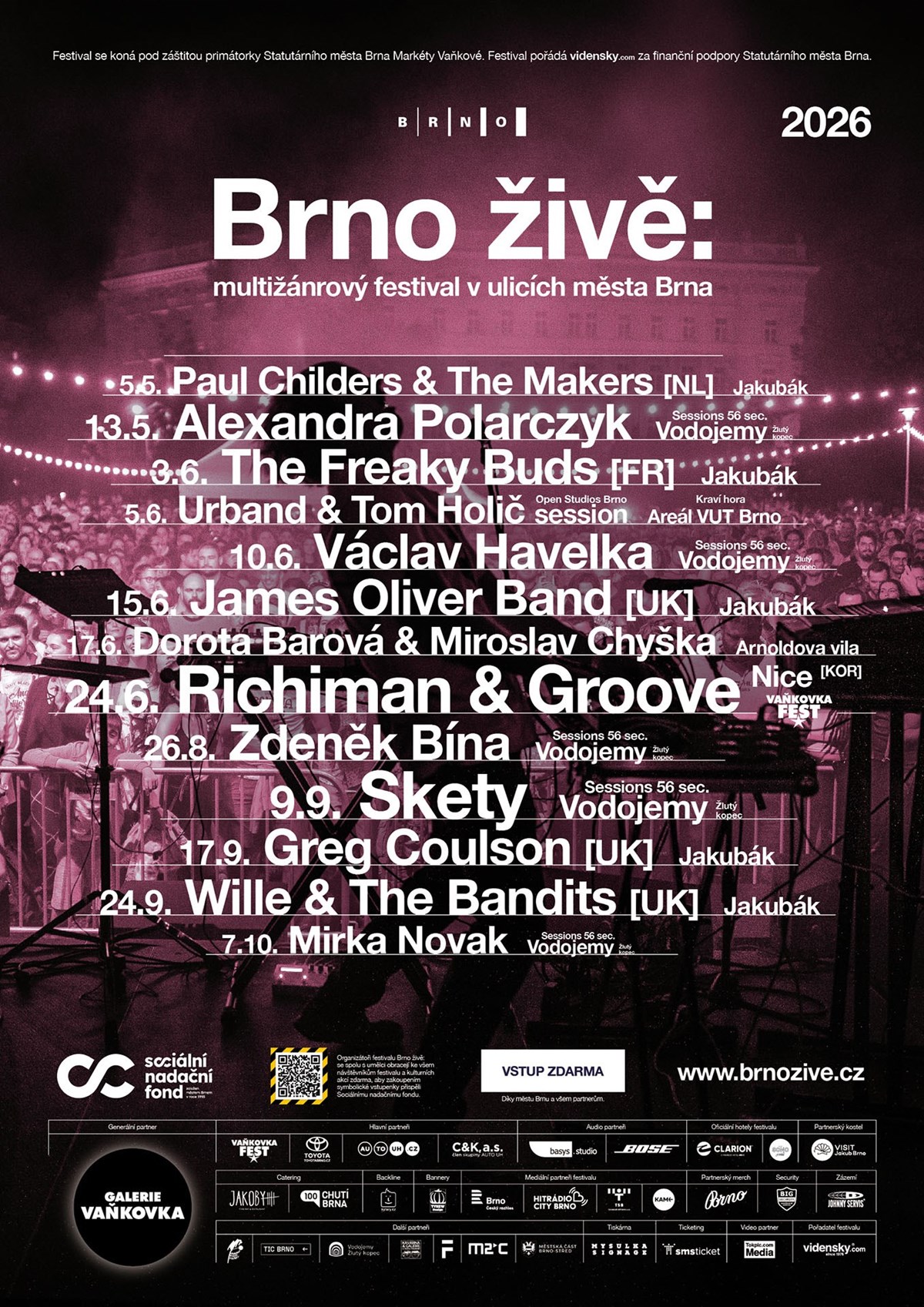 Organizátoři festivalu Brno živě: se spolu s umělci obracejí ke všem návštěvníkům festivalu a kulturních akcí zdarma, aby zakoupením symbolické vstupenky přispěli Sociálnímu nadačnímu fondu. Všechny koncerty jsou díky Statutárnímu městu Brnu a partnerům zdarma.Přispět lze vstupenkami v hodnotě 100 Kč, 250 Kč, 500 Kč, 1000 Kč, nebo 5000 Kč.Tato sbírka je realizována díky iniciativě Kultura pomáhá a smsticket.cz ve spolupráci se Sociálním nadačním fondem města Brna a Jihomoravského kraje, na jehož transparentní účet 225782453/0600 poputuje 100% všech vybraných prostředků.Přijďte si užít koncerty a děkujeme za jakoukoliv podporu!