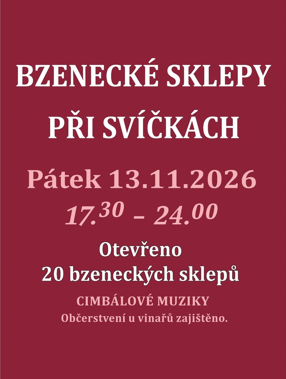 Pojďte zažít nevšední putování za vínem a vinaři do bzeneckých sklípků, které jsou osvíceny svícemi a lampami. 18 vinařství pro Vás bude mít k ochutnávce širokou nabídku od Svatomartinských a mladých, přes ročníková až k perlivým vínům. Těšit se můžete také na bohatou nabídku občerstvení – svatomartinskou husu, zabíjačkové pochoutky, škvarkovou pomazánku, pagáčky, speciality z udírny a určitě v nabídce najdete i něco sladkého. Kyvadlová doprava do vzdálenějších vinařství je zajištěna.