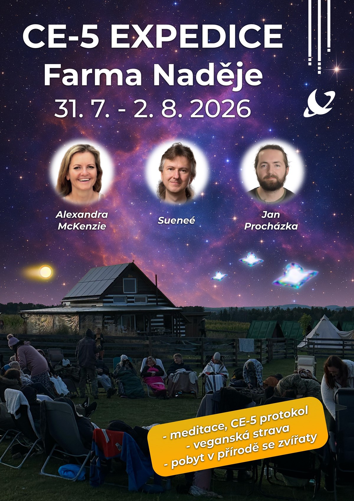 VYPRODANÉ VSTUPENKY? VYBERTE SI JINÝ TERMÍN.Hledáš odpovědi na otázky, které ti běžný svět nedává? Máš pocit, že existuje něco víc, co přesahuje každodenní realitu? Zajímá tě, kdo jsme, odkud pocházíme a proč nás stále silněji přitahuje hvězdné nebe?Přidej se společně s Alexandrou McKenzie, Honzou Procházkou a Sueneém k víkendovému setkání uprostřed přírody na Farmě Naděje, kde skrze klid, sdílení, meditaci a seznámení se s CE-5 protokolem prozkoumáme možnost vědomého kontaktu s mimozemskými civilizacemi, tvojí hvězdnou rodinou – a především sami se sebou. Ano, cesta do vesmíru vede skrze vesmír v každém z nás!V CENĚ VSTUPENKY ZAJIŠTĚNO:Rozsáhlý víkendový programUbytování ve vlastním stanuVeganská strava od páteční večeře do nedělního obědaPobyt v přírodě mezi šťastnými zvířátkySlevový kód na 9. Mezinárodní konferenci UFO, exopolitky, historie a spiritualityPROGRAM:PÁTEK, 31.07.202617:00 - ubytováni a společná večeře21:00 - CE-5 protokol, teorie, trénink a praxeSOBOTA, 01.08.202608:30 - Honza: Ranní joga (dobrovolné)09:00 - Snídaně10:00 - Sueneé: Mýty a fakta o lidech a mimozemšťanech11:00 - Alex: Mimozemská komunikace13:00 - Oběd15:00 - Alex: Trénink vidění do astrálních světů a dálkové nazírání16:00 - Honza: Praktické CE-5 techniky; cvičení povzbuzující periferní vidění17:00 - Večeře19:00 - Meditace a dechová cvičení21:00 - CE-5 protokol, trénink a praxeNEDĚLE, 02.08.202608:30 - Honza: Ranní joga (dobrovolné)09:00 - Snídaně10:00 - Alex, Honza, Sueneé, všichni: Sdílení a společná meditace na závěr12:00 - Oběd14:00 - Vyklízení a odjezdJsi připraven/a na setkat s jinými světy? Přijeď a naučíš se vnímat více než pěti smysly...Lektoři: Alexandra McKenzie, Jan Procházka, Sueneé