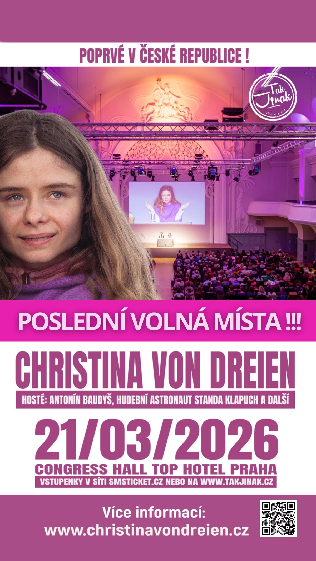 CHRISTINA VON DREIEN POPRVÉ V ČR - Seminář v Praze!!! ZBÝVAJÍ POSLEDNÍ VOLNÁ MÍSTA !!!Zažijte Christinu naživo a nechte se unést léčivou atmosférou! Christina von Dreien se narodila s výrazně rozšířeným vědomím, čímž se řadí k nové generaci mladých evolučních myslitelů, kteří nám odhalují zcela novou dimenzi lidského bytí. Tito ukazatelé směru a iniciátoři nám sdělují, jakou vnitřní hodnotu a velikost my – lidé – máme a kolik pozitivního potenciálu v každém z nás dřímá. Ukazují nám, jak můžeme pomocí síly svého vědomí a bezpodmínečné lásky léčivě a konstruktivně přetvářet život na úrovni jedince i společnosti. Program na webu: www.christinavondreien.czOtevření foyer s prodejními stánky v 10:00Otevření sálu v 11:00 Slavnostní zahájení ve 12:00