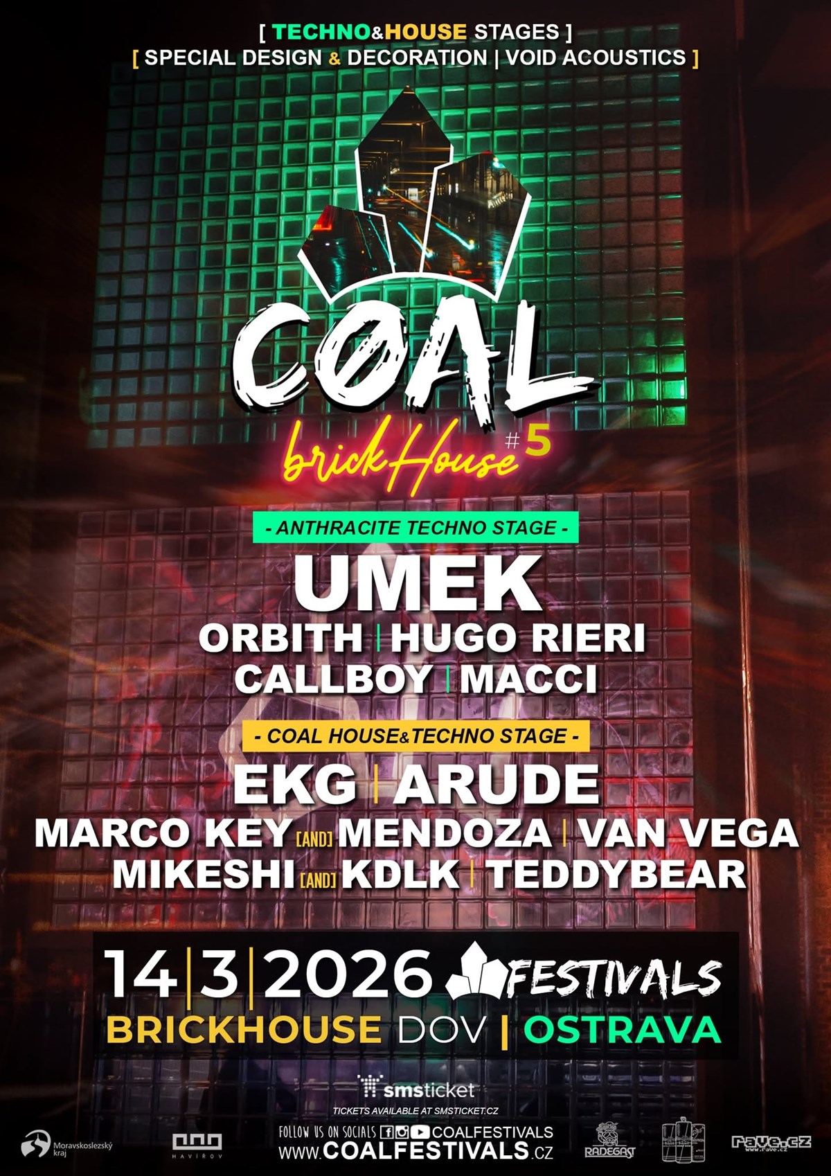 COAL Brickhouse #5: UMEK, EKG, ARUDE a návrat epické atmosféry do DOV!Poslední house & techno edice naprosto předčila naše očekávání! Vaše ohlasy byly fantastické, dům byl plný a energie, kterou jste vytvořili, byla nezapomenutelná. Utvrdili jste nás v tom, že tohle je směr, kterým chceme jít, a proto v konceptu dvou našlapaných žánrových stagí pokračujeme! 🚀Kdo zažil minulou Techno stage zahalenou do těžkých akustických závěsů, ví, o čem je řeč. Byla to epická, temná a pohlcující jízda. A přesně tuhle unikátní atmosféru pro vás chystáme znovu, ale tentokrát ji posouváme ještě o level výš s absolutní legendou světového techna!14. března 2026 se prostor Brickhouse v Dolních Vítkovicích opět promění v chrám elektronické hudby. Čeká vás špičkový zvuk VOID Acoustics, speciální design a dekorace a lineup, který v Ostravě nemá obdoby.Na co se můžete těšit? ANTHRACITE TECHNO STAGE Hlavní hvězdou večera není nikdo jiný než slovinský techno titán UMEK! Doplní ho stálice české scény a skvělí supporti.UMEKOrbithHugo RieriCallboyMacciCOAL HOUSE & TECHNO STAGE Melodické linky, hutné beaty a euforie až do rána. Tady to bude vřít pod taktovkou mistrů svého řemesla.EKGARUDEMarco Key & MendozaVan VegaMikeshi & KdlkTeddybearNenechte si ujít páté pokračování akce, která definuje kvalitu v industriálním srdci Ostravy. Minule to byla jízda, tentokrát bouráme limity. Buďte u toho! Místo: Brickhouse DOV, Ostrava 🗓 Datum: 14. 3. 2026 🔊 Sound: VOID Acoustics