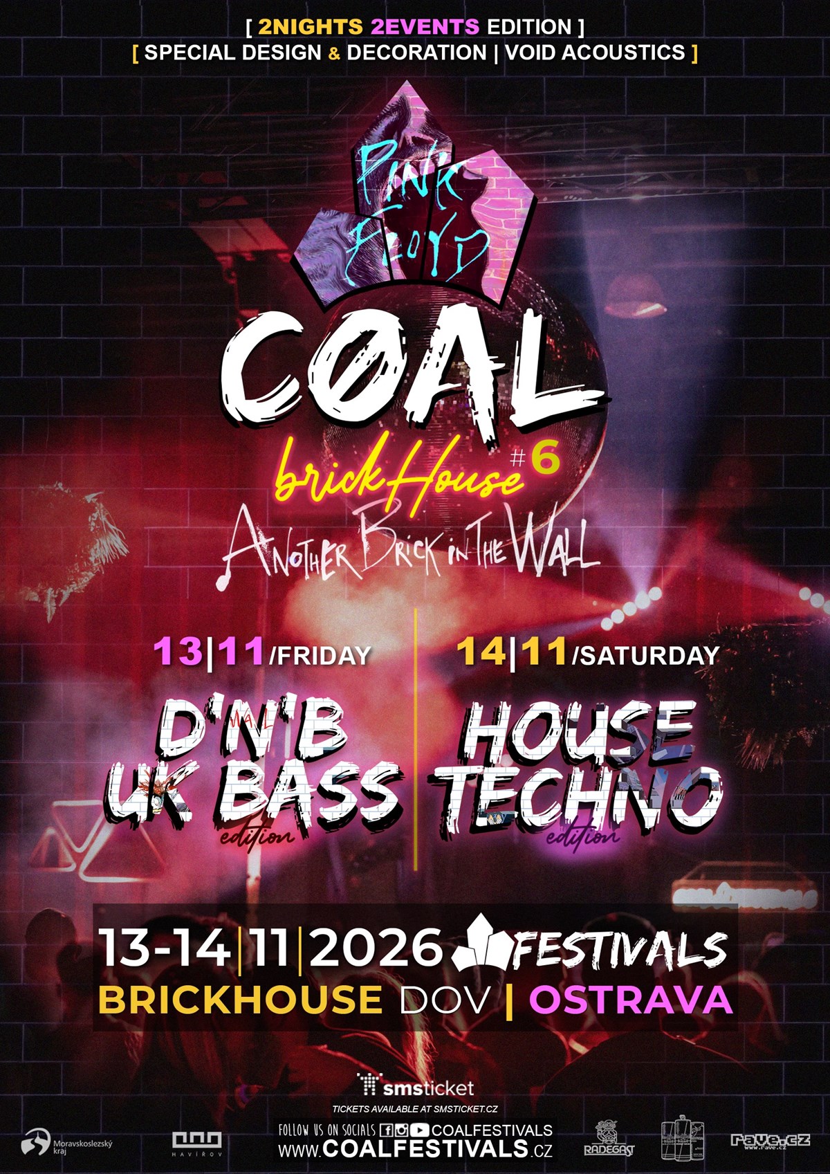 Těžba pokračuje! Po vydařeném pátém díle se vracíme do ostravského Brickhousu s edicí, která nemá obdoby. Tentokrát spojíme síly na celé dva dny. COAL brickHOUSE #6: Another Brick in the WallDvě noci. Dva světy. Jeden industriální revír. PÁTEK 13. 11. 2026 | D'N'B & UK BASS EDITION SOBOTA 14. 11. 2026 | HOUSE & TECHNO EDITIONMísto: Brickhouse DOV, Ostrava 🗓 Datum: 13-14.11. 2026 🔊 Sound: VOID Acoustics