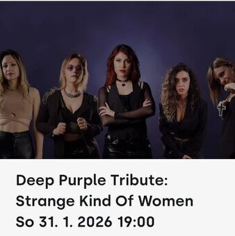 Prodám 2 vstupenky na koncert DEEP PURPLE TRIBUTE:STRANGE KIND OFF WOMEN /Stání Původní cena obou vstupenek byla 1600 Kč. Kč,Nyní prodám 2 vstupenky za 1000 Kč .Předání na místě nebo dle dohody