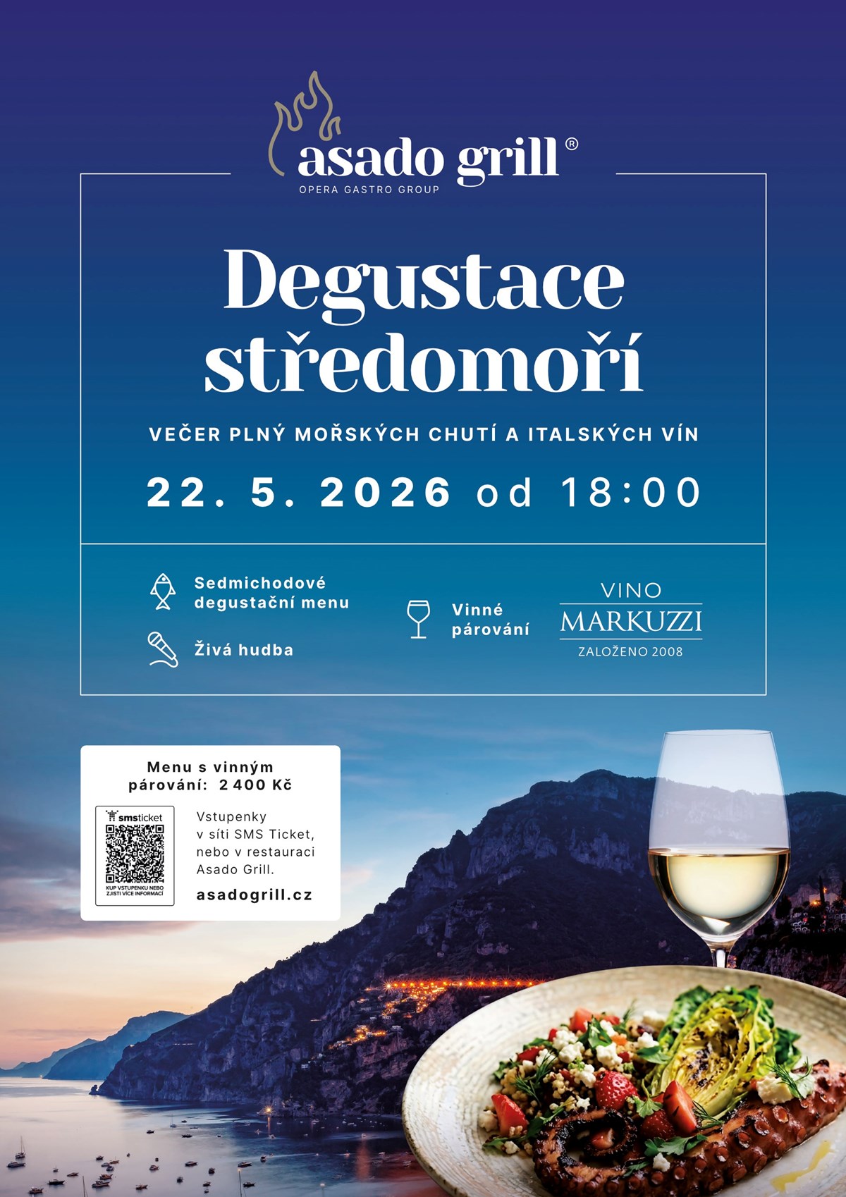 Degustace Středomoří v Asado GrilluVečer, který vás vezme na pobřeží Itálie a Středomoří. Sedm chodů postavených na čerstvých mořských surovinách, výrazných chutích a poctivé kuchařské práci. Nečekejte malé ochutnávky, ale plnohodnotný, sytý zážitek, který má tempo i hloubku.Začíná se langustýnovým máslem s tatarákem a toastem. Pokračují hřebenatky s bylinkovým olejem a kumquatem, následně krevety s řepou a mascarpone. Přijde silný vývar z chobotnice, mezichod s úhořem a řasou a pak hlavní vrchol večera – chobotnice s jahodou, fetou a quinoou. Finále obstarávají nero tagliatelle s vongolemi a vínem.Každý chod doprovází pečlivě vybraná vína z Vino Markuzzi. Živá hudba dotváří atmosféru. Středomořské menu:Amouse boucheLangoustine butter, toastBele Casel, Prosecco di AsoloStudený předkrmHřebenatka, bylinkový olej, kumkquat, brambora, fialkyGabbas, Manzanile, Vermentino di SardegnaTeplý předkrmKreveta, řepa, mascarpone, květákColtezenzio, Pinot GrigioPolévkaSilný vývar z chobotniceMezichodOnigiry, unagi, řasaCastel Juval, Gletcherschliff, RieslingHlavní chodChobotnice, little gem, quinoa, jahoda, fetCordero di Montezemolo, ArneisPoslední chodVongole, nero, semolina, vínoVilla Bucci, Verdicchio di Castello di Jesi VstupenkyCena vstupenky je pro jednu osobu. Možnost zakoupení vstupenky s vinným párováním. Podle počtu zakoupených vstupenek k vám přiřadíme velikost stolu.