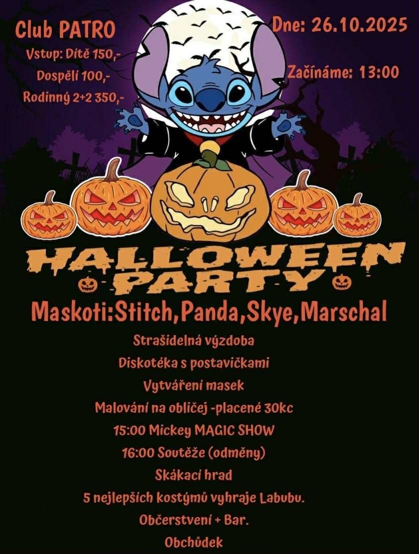 Dětská Halloween party s roztomilými maskoty, soutežemi a kouzelníkemPřijďte si zatančit se Stitchem, Sky, Marschallem a nebo Pandou.Pokud vás nebaví tanec, bude k dispozici skákací hrad, nebo malování na obličej