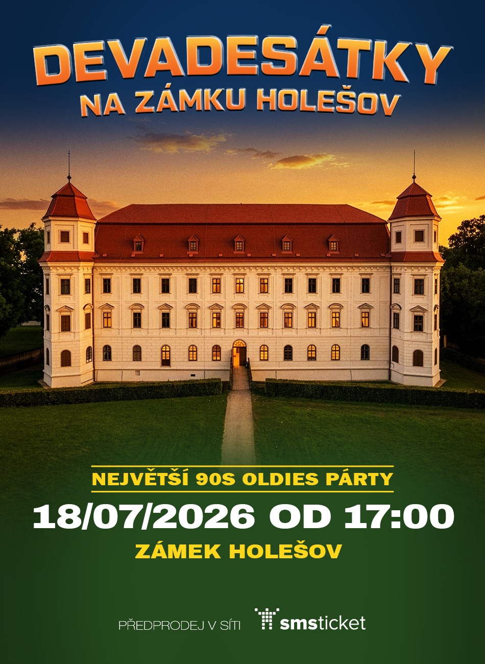 Devadesátky na zámku Holešov!Přeneste se zpět do doby kazetových walkmanů, barevných legín a legendárních hitů! Čeká vás večer plný těch největších hitů 90. let v kouzelném prostředí zámku Holešov! Taneční parket pod hvězdami, drinky jako za starých časů a atmosféra, která vás vrátí zpět do doby, kdy jsme pařili na Jacksona, Madonu, Haddaway, Snap!, Backstreet Boys, Eiffel 65, Dr. Alban nebo 2 Unlimited. DJs a moderátoři, co rozjedou největší hity 90. letStylová výzdoba a světelná showDresscode vítán: 90's vibes!Bar s tematickými drinkyPřijďte si užít večer, kde se hudební minulost propojí se skvělou atmosférou současné párty – na zámku, který se na jednu noc promění v místo plné hitů, tance a vzpomínek!