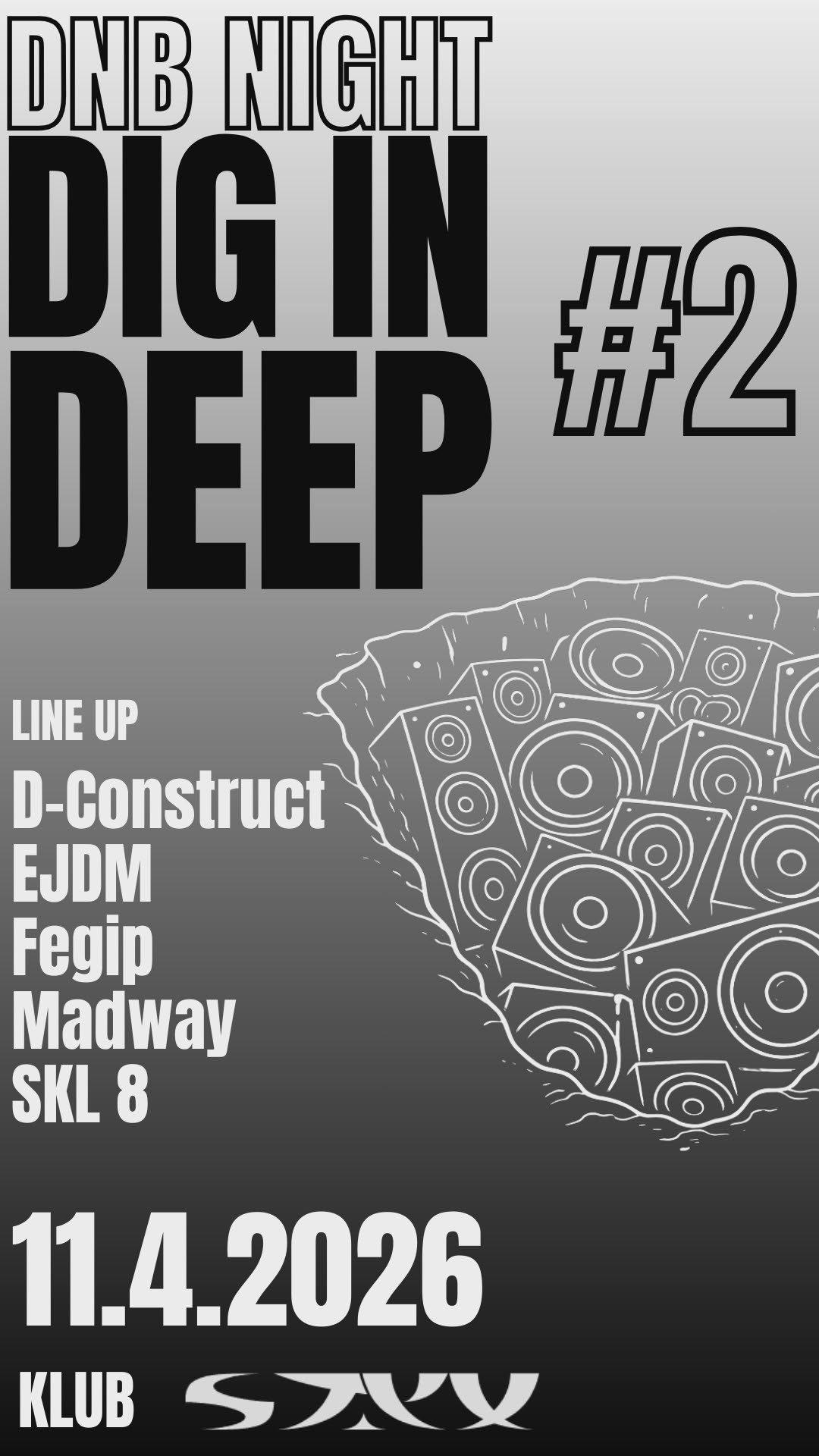 DIG IN DEEP je DNB noc zaměřená na hloubku, groove a energii spodních frekvencí. Po první edici pokračujeme tam, kde jsme skončili – ještě hlouběji do bassových tlaků a atmosféry parketu. Nečekej jen deepy. Čekej prostor, energii a společný vibe, který tě vytáhne nahoru. Dost bylo elektronického populismu. Poslechni si synergii. LINE UP D-Construct EJDM Fegip Madway SKL 8 Sets: deep / minimal / rollers / techstep / neuro / techgroove-focused DNB