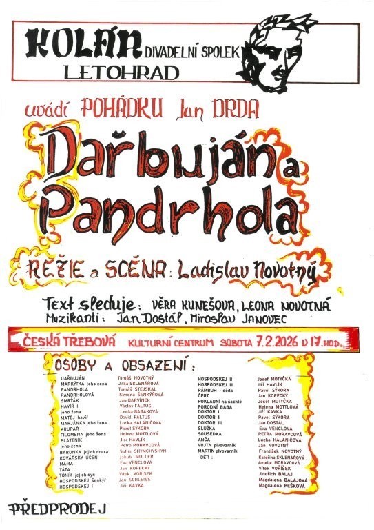 Kdo by neznal film z roku 1958 Dařbuján a Pandrhola se skvělými českými herci , který Česká televize vysílá vždy ke konci roku. Divadelní soubor Kolár Letohrad se pokusil tuto pohádku od Jana Drdy uvést na divadelní jeviště . Díky nápadité, variabilní scéně zvládli jednotlivé obrazy hry rychle měnit. V divadle nechybí jitrnice na borovici, ani pivo v potoce.Režie: Ladislav NovotnýPředprodej vstupenek na www.kcct.cz, v Městském muzeu (Klácelova 11), v kanceláři Kulturního centra (Nádražní 397) a 1 hodinu před začátkem u pokladny.