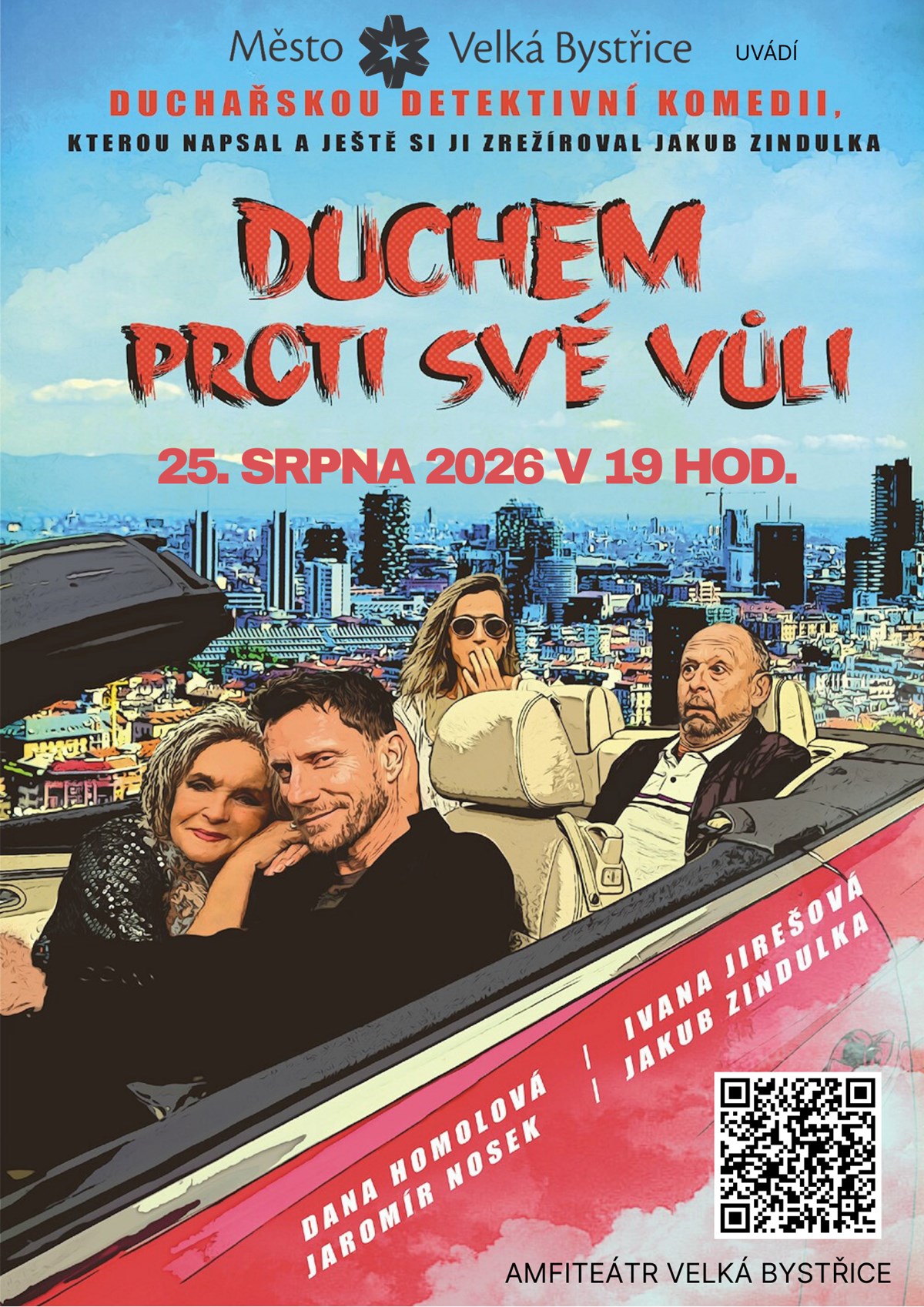Open-air představení.Hrají Jaromír Nosek, Jakub Zindulka, Ivana Jirešová a Dana Homolová.Bylo úmrtí slavné herečky přirozené, nebo to byla vražda?A straší její duch opravdu, nebo jen nevěrnému manželovi straší "ve věži"?A přibude ještě další oběť?A bude zlo potrestáno, jako v každé dobré pohádce?Odpovědi se dozvíte v nové, tentokrát duchařské detektivní bláznivé komedii Fanny agentury − opět z pera Jakuba Zindulky.