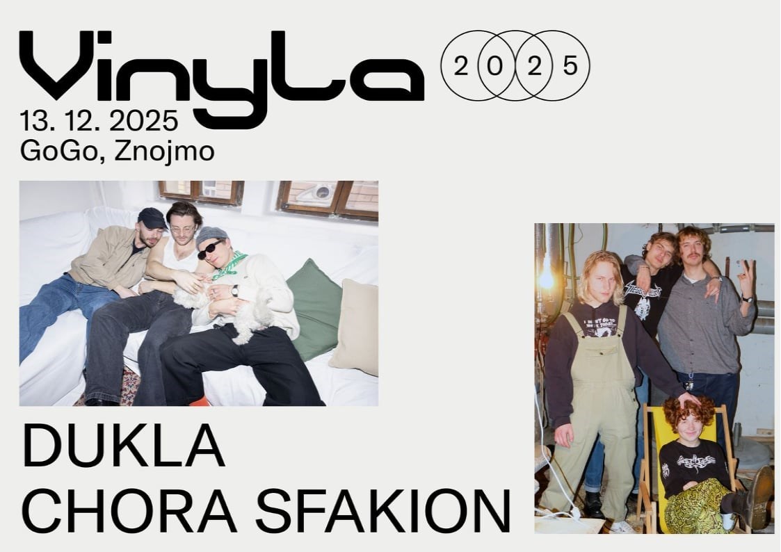 DuklaPražské trio Dukla přísahá na sílu melodií a poetiku českých textů. Jedna z nejoblíbenějších kapel české alternativní/indie scény má kořeny na pražské scéně z poloviny minulé dekády, Dukla vznikla, když se Lukáš Vydra a Josef Hradilek rozhodli skončit s anglickými texty a přimknuli se k tradici českého písničkářství. Generační hity I.P. Pavlova, Holka se psem nebo Dny vypráví o nešťastných láskách nebo všeprostupující úzkosti. V jejich popových smuténkách jsou slyšel ohlasy na Petra Nováka i Spiritual Kvintet, zatím poslední album Stejný lepší ale také duní klubovými beaty a hostuje na něm rapper TK27. Koncert ve Znojmě bude je součástí turné k čertstvě vydanému EP Další rok.Chora SfakionPost-punková naděje ze Znojma. Kvarteto v čele s charismatickou zpěvačkou Michaelou Frindovou se vynořilo z komunity kolem klubu Gogo, se skladbou Sýrovka úspěšně bodovali ve Startéru Radia Wave a zakotvili na Indies Scope, kde na jaře vychází jejich debut. Chora Sfakion existují jen dva roky, ale už stihli ohromit (nejen) brněnskou scénu – v Praze předskakovali třeba skupině Tomáš Palucha. Hrají výbušnou směs post-punku, noise rocku a no-wave, sami svůj osobitý zvuk popisují jako gastropunk, což odráží jejich lásku k jídlu všeho druhu.