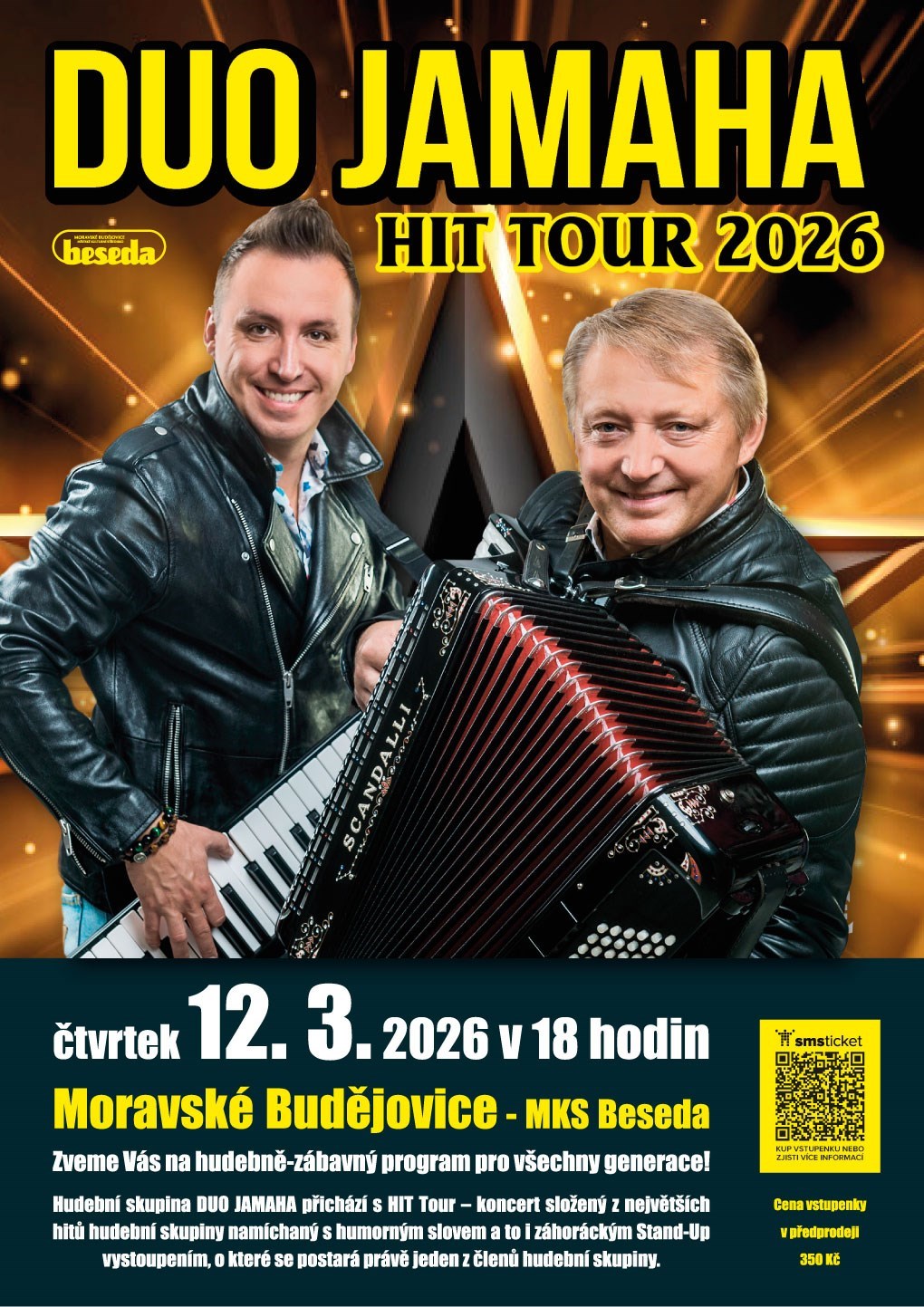 Zveme Vás na hudebně-zábavný program pro všechny generace!Hudební skupina DUO JAMAHA přichází s HIT Tour – koncert složený z největších hitů hudební skupiny namíchaný s humorným slovem a to i záhoráckým Stand-Up vystoupením, o které se postará právě jeden z členů hudební skupiny.Skupina je známá hlavně z televizních obrazovek a rádií. Získala za prodej nosiče zlaté a platinové desky, Oscara Smago Awards, a jiná ocenění... přichází Vás opět zabavit a připravili si nezapomenutelný zážitek plný hudby a humoru. Přijďte si zazpívat, odreagovat se a načerpat tu správnou energii. Na koncertě zazní rytmické melodické písně, starší a novější hity!Tisíce lidí a fanoušků vidělo poslední turné po České a Slovenské republice.Těšíme se opět na Vás! Bude to skvělá jízda!Předprodej vstupenek v síti smsticket.cz a turistickém informačním centru Moravské Budějovice.Vstupné na místě 390 Kč.
