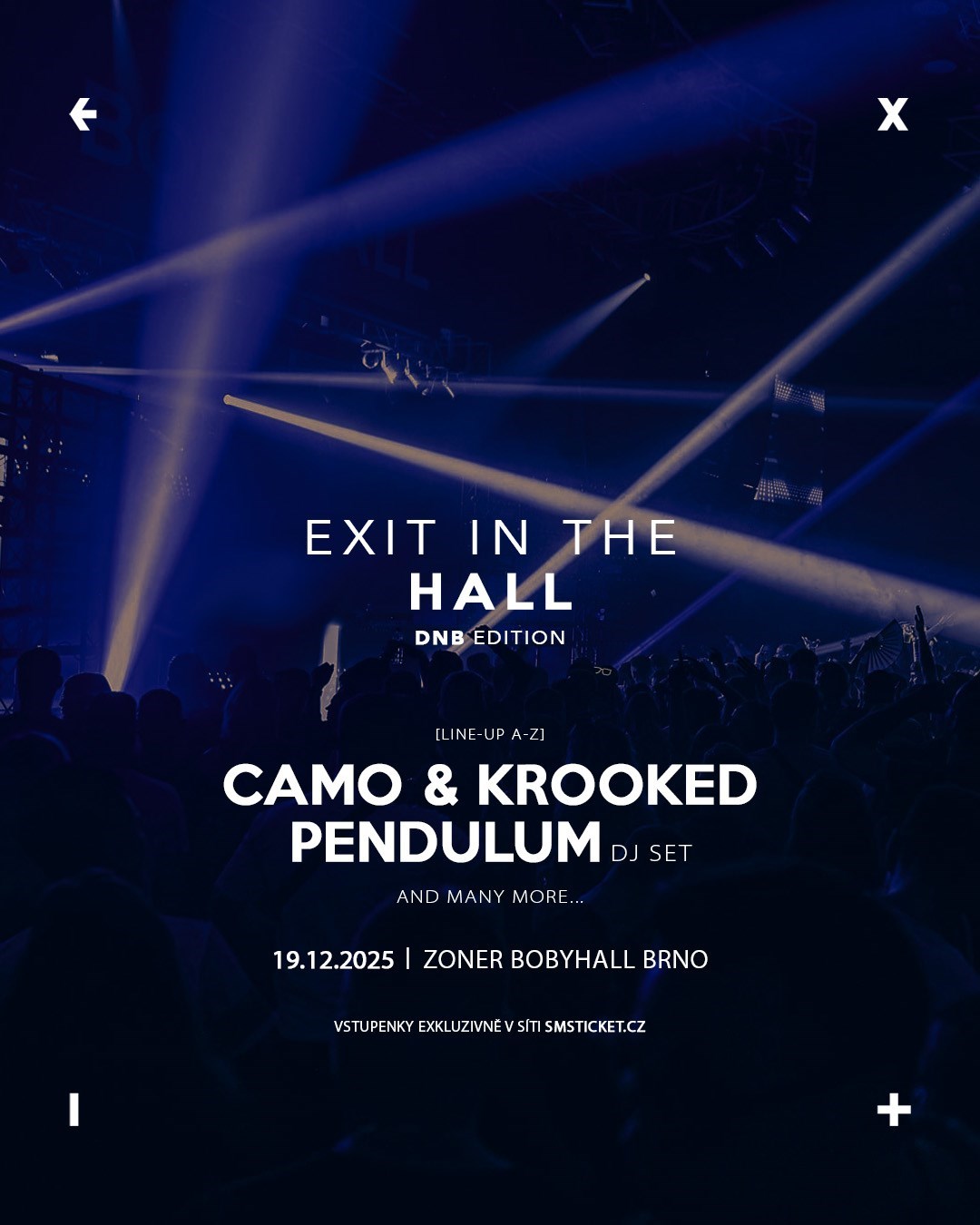 DnB edice EXIT In The Hall se vrací 19.12. v plné síle do Zoner Boby Hall! 🔥 Tentokrát pozvání přijali legendární 𝐏𝐞𝐧𝐝𝐮𝐥𝐮𝐦 (DJ set) z Austrálie, rakouští velikáni 𝐂𝐚𝐦𝐨 & 𝐊𝐫𝐨𝐨𝐤𝐞𝐝 a další trojice headlinerů, které vám postupně odtajníme! ☝Early bird vstupenky jsou již v předprodejní síti smsticket.cz▌EXIT In The Hall [DnB edition]▌Fri. 19.12.2025▌Zoner BOBBYHALL, Brno▌Start 20:00L̶i̶n̶e̶-̶u̶p̶:̶ [A-Z]𝐂𝐀𝐌𝐎 & 𝐊𝐑𝐎𝐎𝐊𝐄𝐃 [AT]𝐏𝐄𝐍𝐃𝐔𝐋𝐔𝐌 [DJ set / AUS]and many more...