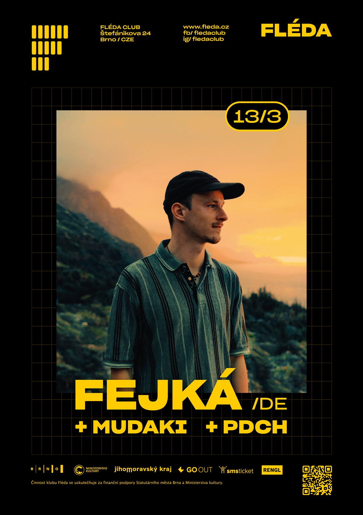 For EN scroll down... Německý producent Fejká vystoupí 13. března v brněnské Flédě se speciálním setem odehraným v davu. Díky intimnímu a intenzivnímu zážitku na pomezí deep housu a techna, kde se melancholie potkává s euforií, se klub změní v jeden velký pohlcující prostor. Support zajistí MUDAKI a PDCH, jejichž sety rovněž proběhnou v publiku!Fejká (DE)Fejká je synonymem silné atmosféry. Ve své tvorbě propojuje zasněné melodie s pulzujícím deep housem a technem a vytváří emocionální zvuk, který na tanečním parketu není běžný. Pohybuje se na hraně mezi melancholií a euforií, klidem a pohybem – s důrazem na náladu, hloubku a vnitřní napětí.Pochází z oblasti Černého lesa v Německu a už v šestnácti letech si ho všimla elektronická ikona Christian Löffler, která nastartovala jeho kariéru. Od té doby Fejká nasbíral přes 100 milionů streamů, dostal se na #1 místo v elektronickém playlistu Apple Music a absolvoval rozsáhlé turné, včetně ikonického sunrise live setu na festivalu Fusion.Fejká je také vystudovaný filmař a veškerou vizuální stránku svého projektu si vytváří sám. Spolupracoval s umělci jako Christian Löffler, Hania Rani nebo Jan Blomqvist a jeho hudbu podporují například Ben Böhmer, Kiasmos nebo James Grant (Anjunadeep), kteří jeho skladby pravidelně zařazují do svých DJ setů.Rok 2025 znamenal zásadní zlom – po osmi letech na labelu Ki Records založil Fejká vlastní značku Coexist, zaměřenou na vztah mezi uměním a přírodou. Pod touto hlavičkou kurátoruje klubové noci i denní koncerty ve Stuttgartu a zve hosty jako Weval, Löffler nebo Kiasmos.Jeho třetí studiové album AZUR (vyšlo 25. dubna 2025) čerpá inspiraci z Kanárských ostrovů, místa osobního klidu, kreativity a blízkých vztahů. Hřejivý, éterický zvuk desky odráží energii ostrovů a stal se pevnou součástí setů předních jmen světové elektroniky. Album mu rychle otevřelo cestu na hlavní pódia mezinárodních festivalů jako DGTL nebo Miami Music Week a vyprodané koncerty v Praze, Hamburku či Amsterdamu.Fejká dnes patří k výrazným jménům melodické elektroniky, která nestaví na okázalosti, ale na emocích a propojení s publikem – což dokonale vystihne i jeho speciální set odehraný přímo uprostřed publika. MUDAKI (phonon~)Příběh mʊdʌki začíná v Minsku a pokračuje přes Ústí nad Labem až do Prahy, kde se stala výraznou kurátorkou deep listening akcí a členkou kolektivu phonon~ zaměřeného na bass-driven večírky. Její DJ sety obsahují vlivy junglu, dubstepu a tekna, které vnímá vlastní optikou a hledá hřejivé teplo v distorzi a tvar v chaosu. PDCHS více než deseti lety za mixážním pultem je DJ PDCH ostřílenou silou brněnské undergroundové hudební scény. Skutečný hudební chameleon, jeho sety pokrývají celé spektrum zvuku – od hlubokých ambientních textur a hypnotických downtempo rytmů až po energické taneční jízdy kde se prolíná house, techno, breaky, trance a vše mezi tím, vždy s precizností a emocionální hloubkou.PDCH do každého setu vnáší globální hudební perspektivu. V Brně je oporou místní scény jako dlouholetý rezident klubu pul.pit, kde již čtyři roky po sobě kurátoruje uznávanou sérii akcí OMEN, posouvající hranice a formující jedinečnou progresivní zvukovou identitu.Ať už večírek otvírá a nebo ho vede k vrcholu, PDCH vytváří strhující hudební cesty, které zůstávají v paměti ještě dlouho po rozsvícení světel.