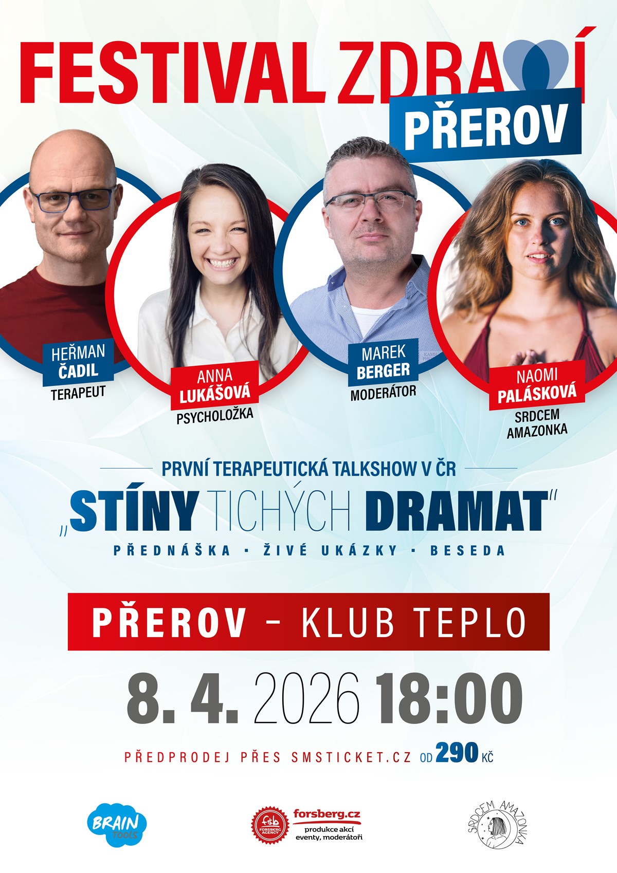 STÍNY TICHÝCH DRAMAT: PRVNÍ TERAPEUTICKÁ TALK SHOW & FESTIVAL ZDRAVÍPonořte se s námi do hlubin emocí, které ovlivňují Váš život.Přijměte pozvání na unikátní terapeutickou talk show a festival zdraví, kde se poprvé setkávají špičky české psychologie a inspirativní osobnosti, aby otevřely témata, o kterých se obvykle mlčí.Tento večer není o přednášce, ale o živém dialogu, silných příbězích a praktických ukázkách, jak zvládat své "tiché bitvy". HOSTÉ A TÉMATA:Mgr. Heřman Čadil, MBA: Renomovaný psycholog, terapeut a kouč. Z Olomouce se zkušeností z terapie a psychosomatiky. Podělí se o techniky, jak změnit nastavení mysli a uniknout myšlenkovým pastem.Mgr. Anna Lukášová: psycholožka, certifikovaná krizová interventka a koučka, frekventantka výcviku v analytické psychoterapii. Spojí hudbu, emoce a psychologii v živých scénkách o vztazích a našich vnitřních vzorcích – o tom, co nás spojuje, i co nám někdy brání být si blízko.Naomi Palásková – Srdcem Amazonka: Žena s neuvěřitelnou vnitřní silou a inspirativním životním příběhem. Ukáže, jak proměnit strach v odvahu a najít sílu ve vlastním prožívání. CO VÁS ČEKÁ:První terapeutická Talk Show: Autentická beseda plná upřímných odpovědí a živých ukázek.Hudba, která léčí: Večerem nás provede hudební doprovod, který umocní emocionální prožitek a pomůže Vám relaxovat.Interaktivní ukázky a diskuse: Nejde jen o pasivní poslech. Budete mít možnost pokládat otázky a odnést si konkrétní nástroje pro svůj osobní restart.Moderátor: Večerem Vás provede Marek Berger Přijďte se inspirovat, léčit duši a najít cestu ke svému zdravému já.Stíny tichých dramat čekají na to, až je společně osvětlíme. Bude to večer plný energie, upřímnosti a hluboké regenerace. Cena vstupenky:I. vlna předprodeje - do 8. 3. 2026: 290 KčII. vlna předprodeje - do 7. 4. 2026: 340 KčCena v den konání akce online i na místě: 390 Kč
