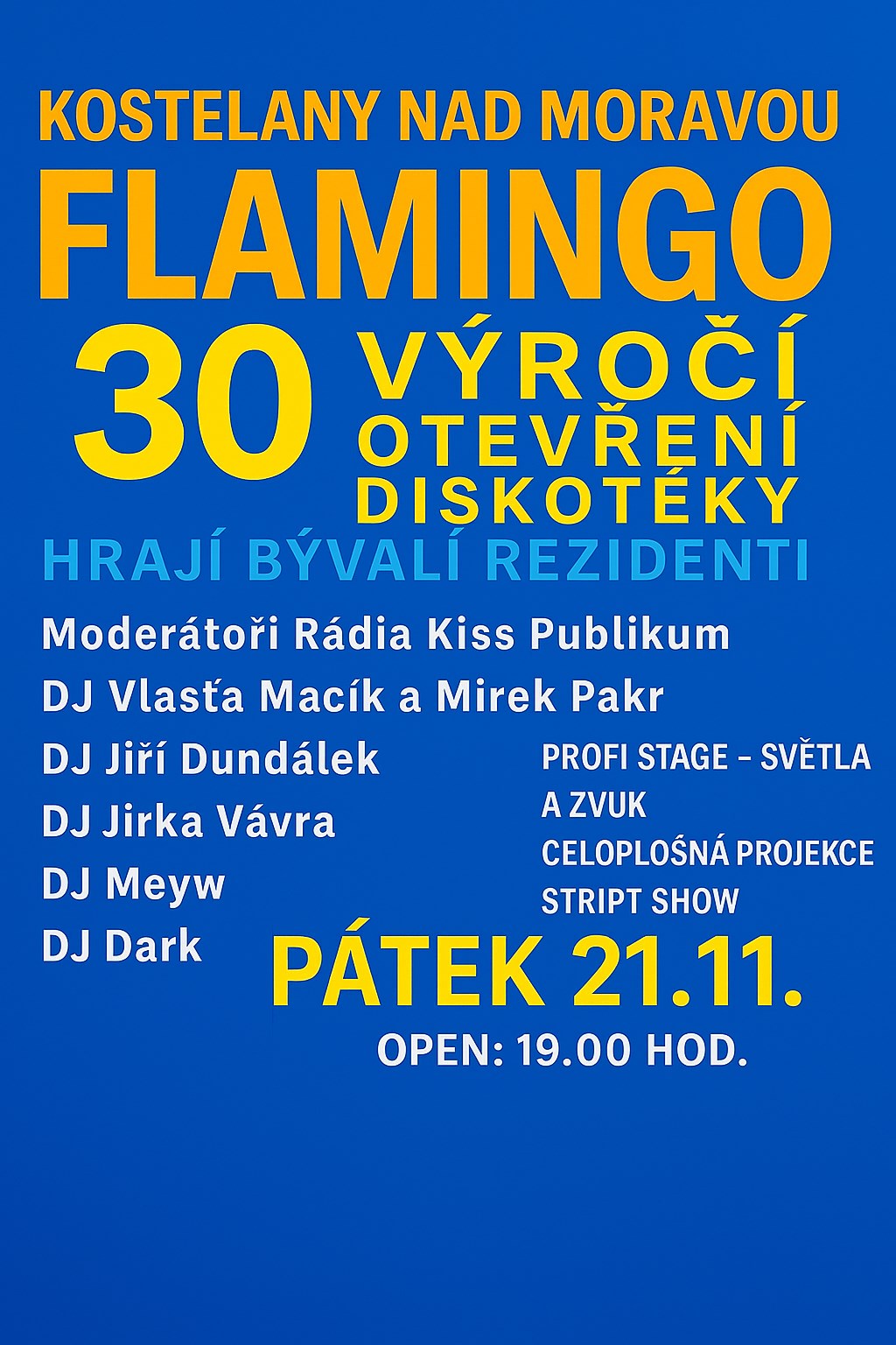 FLAMINGO – 30 LET!Legendární diskotéka FLAMINGO, fenomén devadesátých a nultých let, slaví 30. výročí svého otevření! Místo, kam 17 let pravidelně mířili příznivci z celého okolí, kde se střídaly generace a které bylo svého času nejnavštěvovanější diskotékou ve Zlínském kraji.Přijďte zavzpomínat na zlaté časy a zažít atmosféru, kterou si pamatujeme! Hrají bývalí rezidenti: 🎧 Moderátoři Rádia Kiss Publikum DJ Vlast’a Macík & Míra Park 🎧 DJ Jiří Dundálek 🎧 DJ Jirka Vávra 🎧 DJ Meyw 🎧 DJ DarkTěšit se můžete na: Profi stage ( špičková světla a zvuk ) Celoplošnou projekci ( sestřih foto, videjí z akcí, jak to u nás v této době vypadalo) Laser show Stript showPřijďte si užít jednu z největších oslav taneční scény u nás! Co na závěr dodat, jen slogan používaný 17 let 🔊 TAK NEVÁHEJTE, NA FLAMIGO V PÁ 21.11. POSPÍCHEJTE !!! 🔊