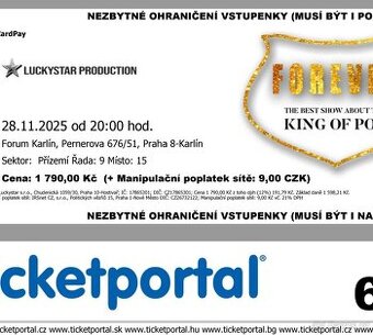Prodám vstupenku na koncert Forever King of pop Michael Jackson, 28.11., 20.00h Fórum Karlín, přízemí, řada 9, sedadlo 15, původní cena 1790,- Prodám za 1500kč. Nejlépe osobně před koncertem na místě, možno i mailem po zaplacení.