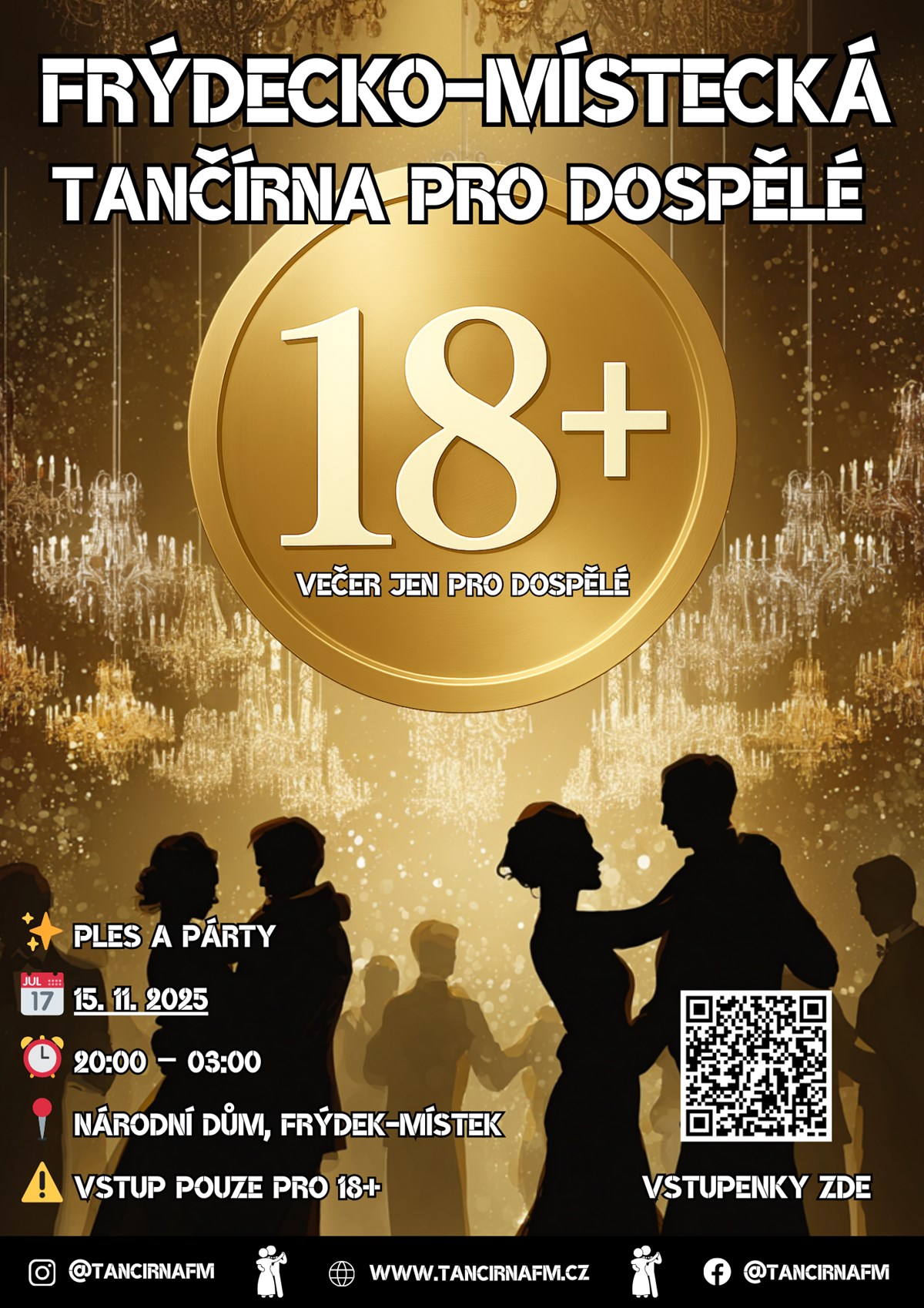 Speciální 18+ TančírnaPřijď si užít jedinečnou 18+ Tančírnu15. 11. 202520:00 – 03:00Národní dům, Frýdek-Místek1. vlna vstupenek: 250 KčNečekej dlouho – lístky mizí rychle a tohle je akce, kterou si nechceš nechat ujít!Proč speciální 18+?Tahle Tančírna je jen pro dospělé – bez mladších účastníků, bez omezení, v klidu a pohodě.Můžeš si tak naplno užít večer v prostředí lidí, kteří chtějí to samé: zábavu, tanec a příjemnou atmosféru. Co tě čeká?Společenská a latinskoamerická hudba, atmosféra plesuEnergická párty s DJem, který to pořádně rozjedeBohatě zásobené bary s přátelskou obsluhouPárek v rohlíku pro posilněníStylový foto-koutekČas strávený s přáteli v dospělém prostředí Vstup pouze pro 18+ (kontrola OP u vstupu)Společenský oděv vyžadován Užitečné odkazy: linktr.ee/tancirnafmTým Frýdecko-Místecké Tančírny