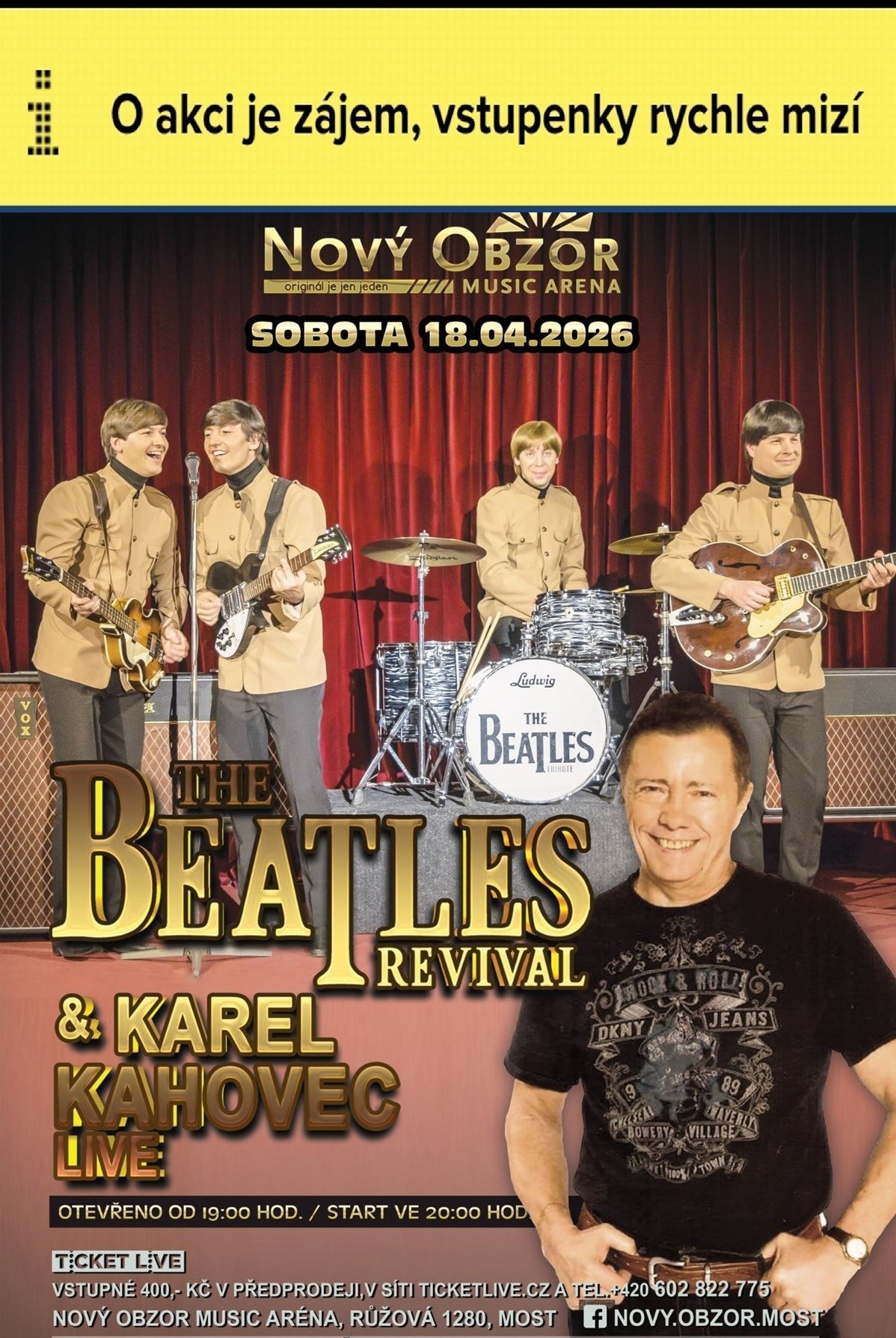 Narozeninový koncert legendárního Karla Kahovce 2026! v sobotu 18.4.2026 od 20:00 Music Arena Nový Obzor - MOSTNEČÍSLOVANÉ SEZENÍ A STÁNÍZveme vás na výjimečný hudební večer, kde své životní jubileum oslaví nezaměnitelný Karel Kahovec – ikona českého bigbítu a jeden z nejvýraznějších hlasů své generace.Na jednom pódiu se představí společně se skupinou The Beatles Revival, která koncert obohatí o nesmrtelné hity slavných „Brouků“.Můžete se těšit na největší Kahovcovy písně, mezi nimi například:Háj ModřínůPaní v černémSvou lásku jsem rozdalPoprava blond holkyA samozřejmě nebudou chybět legendární skladby The Beatles, které dodají večeru jedinečnou atmosféru.Součástí koncertu bude také vzpomínka na Petra Nováka, jednoho z největších hlasů české hudby. Připomeneme si jeho nezapomenutelné hity:PovídejHvězdičko blýskaváJá budu chodit po špičkáchNáhrobní kámenPřijďte zažít večer plný emocí, velkých hitů a pocty třem hudebním legendám.Tahle narozeninová oslava bude stát za to!