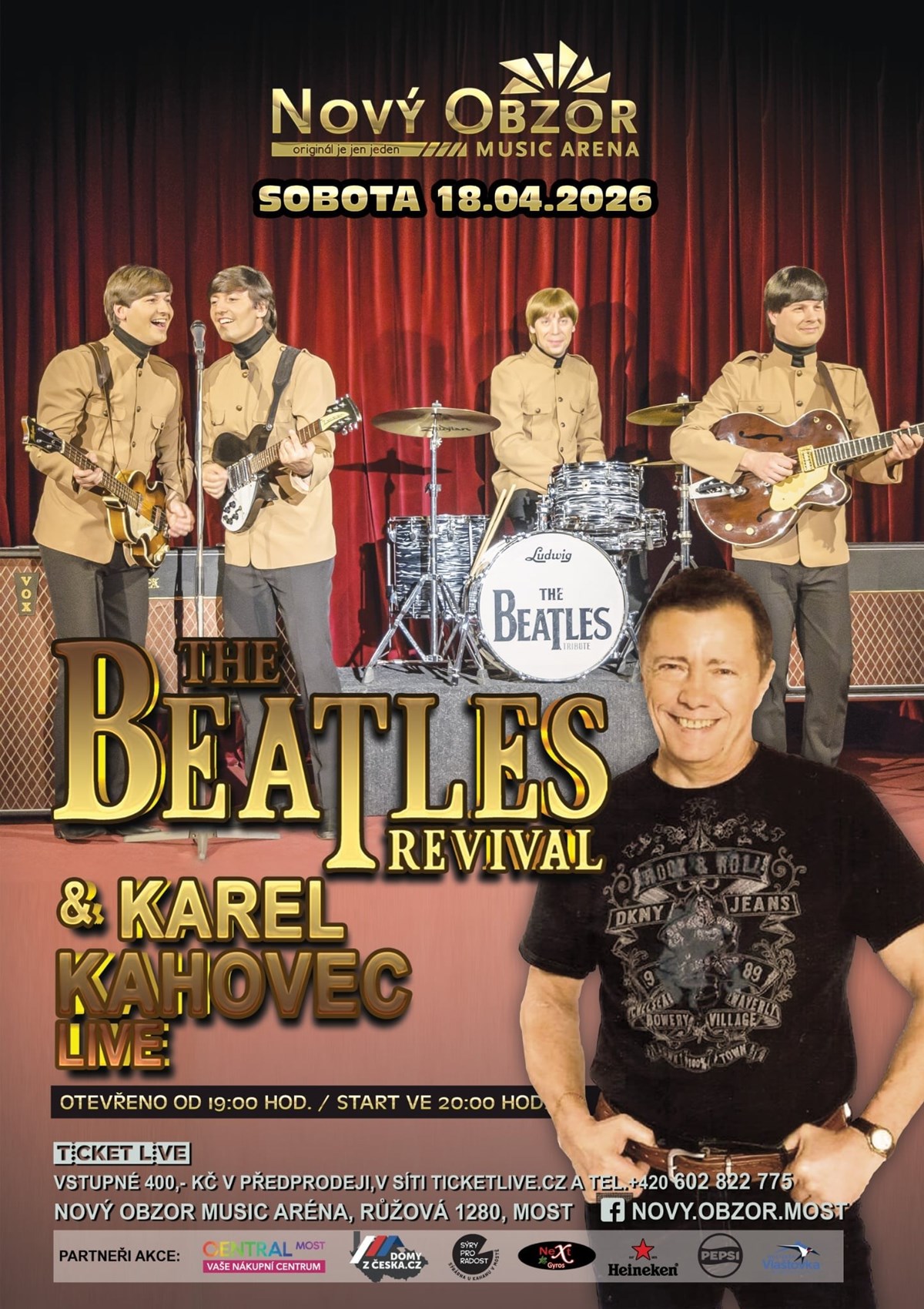 Narozeninový koncert legendárního Karla Kahovce 2026! v sobotu 18.4.2026 od 20:00 Music Arena Nový Obzor - MOSTNEČÍSLOVANÉ SEZENÍ A STÁNÍZveme vás na výjimečný hudební večer, kde své životní jubileum oslaví nezaměnitelný Karel Kahovec – ikona českého bigbítu a jeden z nejvýraznějších hlasů své generace.Na jednom pódiu se představí společně se skupinou The Beatles Revival, která koncert obohatí o nesmrtelné hity slavných „Brouků“.Můžete se těšit na největší Kahovcovy písně, mezi nimi například:Háj ModřínůPaní v černémSvou lásku jsem rozdalPoprava blond holkyA samozřejmě nebudou chybět legendární skladby The Beatles, které dodají večeru jedinečnou atmosféru.Součástí koncertu bude také vzpomínka na Petra Nováka, jednoho z největších hlasů české hudby. Připomeneme si jeho nezapomenutelné hity:PovídejHvězdičko blýskaváJá budu chodit po špičkáchNáhrobní kámenPřijďte zažít večer plný emocí, velkých hitů a pocty třem hudebním legendám.Tahle narozeninová oslava bude stát za to!