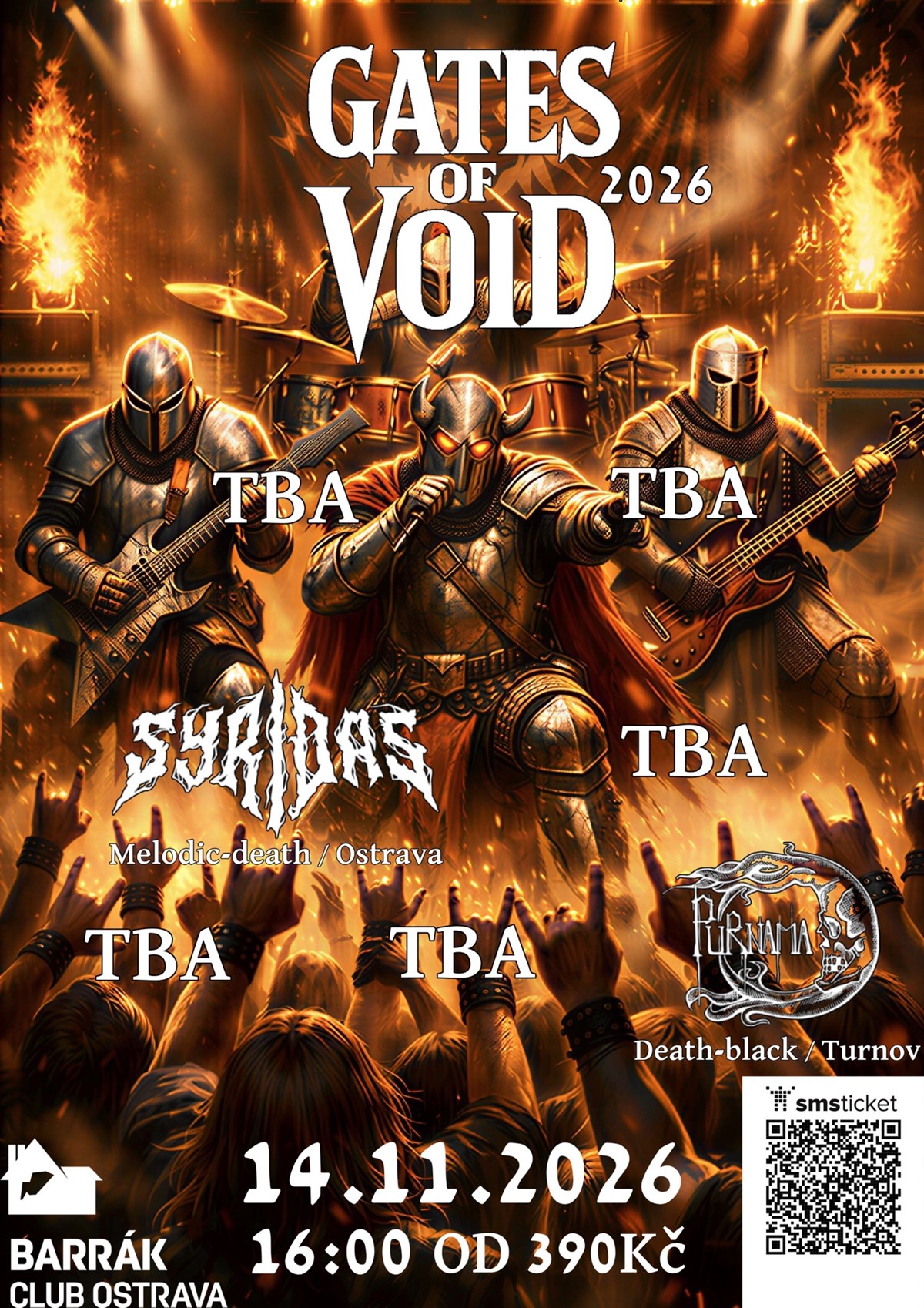 Gates of Void 202614. listopadu 2026Klub Barrák, OstravaOtevření klubu od 16:00Připravte se na pořádnou dávku tvrdé muziky! V jednom večeru se na pódiu ostravského Barráku představí sedm kapel, které vám rozproudí krev, rozvibrují kosti a nabijí energii na měsíce dopředu. Gates of Void není jen festival — je to metalový rituál, kde se setkávají legendy i nadějné nové tváře tvrdé scény.Line-up:Purnama (Liberec/Turnov)Purnama je česká death/black metalová kapela působící od roku 2011. V roce 2017 vydali debutové album Lioness, které jim pomohlo získat širší pozornost na domácí scéně. V roce 2020 následovalo druhé album Flame of Rebellion, které nahráli ve studiu The Barn a mixovali ve Švédsku pod dohledem Andyho LaRocqueho (King Diamond). Toto album vyšlo pod hlavičkou MetalGate Records a kapela k jeho podpoře absolvovala rozsáhlé turné v ČR i zahraničí. Purnama jsou známí nejen tvrdou hudbou, ale i charitativními projekty, jako je Metal for Hope, který pomáhá dětem s onkologickými nemocemi. Jejich vystoupení jsou intenzivní, technicky precizní a plná temné atmosféry.Syridas (Ostrava)Mladá, ale výrazně rostoucí kapela melodického death metalu, která vznikla v roce 2021. Po velmi úspěšném debutu Awaken (2021) vydali v roce 2024 druhé album When Death Calls, které potvrdilo jejich pozici na české metalové scéně. Syridas si během krátké doby získali pozornost nejen klubových návštěvníků, ale i fanoušků na festivalech jako MetalGate Czech Death Fest nebo Slezskoostravský hrad. Jejich živá vystoupení jsou plná energie, technické preciznosti a emotivního projevu, který zanechá silný dojem. Pokud hledáte moderní melodický death metal s autentickým nábojem, Syridas rozhodně stojí za pozornost.