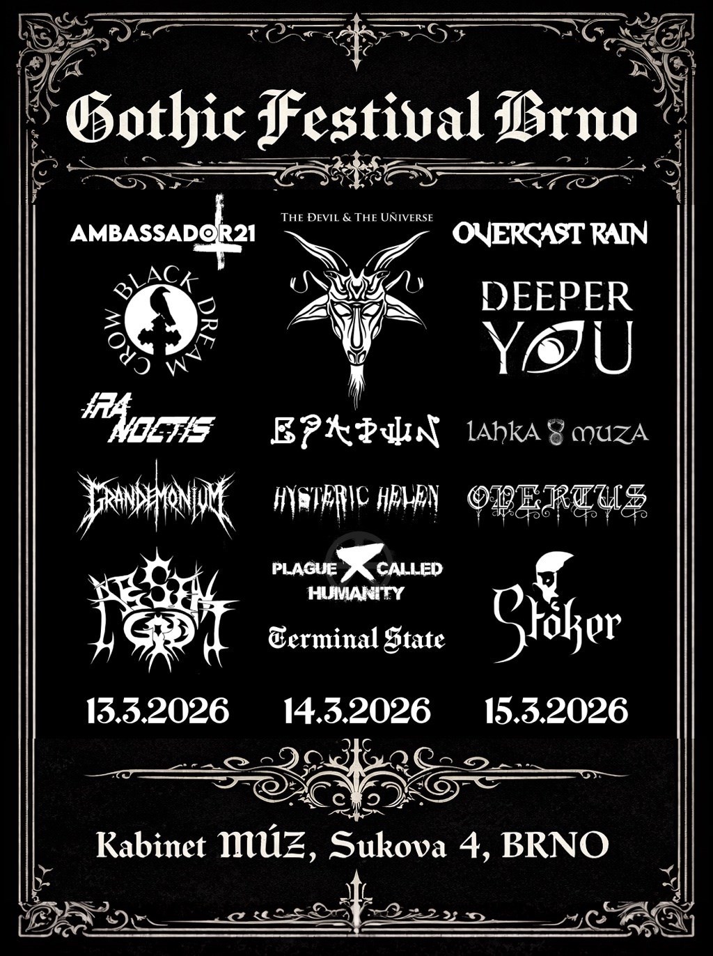 První ročník třídenního gothic indoor festivalu navazuje na dlouholetou tradici gothic koncertů v Brně. Během tří večerů se představí 15 kapel, které nabídnou pestrou žánrovou paletu sahající od dark wave až po gothic metal.THE DEVIL & THE UNIVERSE (AT) - ghost waveDEEPER YOU (AT) - dark rockAMBASSADOR21 (BY) - industrial hardcoreIRA NOCTIS (PL) - dark electro / aggrotechCrow Black Dream (HU) : dark wave / gothicLahka Muza (SK) - dark alternativeEpadun (CZ) - occult neoclassical darkwaveHysteric Helen (SK) - gothic / post-punkOpertus (CZ) - epic gothic metalOvercast Rain (LV) - dark gothic metalTerminal State - Electro (SK) - electroGrandemonium (CZ) - dark electro / cyber gothPlague Called Humanity (CZ) - cyberpunk / industrialStoker (CZ) - gothic rockAbsent God (CZ) : doom metal / sludgeKabinet MÚZ Brno : 13.3.2026 - 15.3.2026