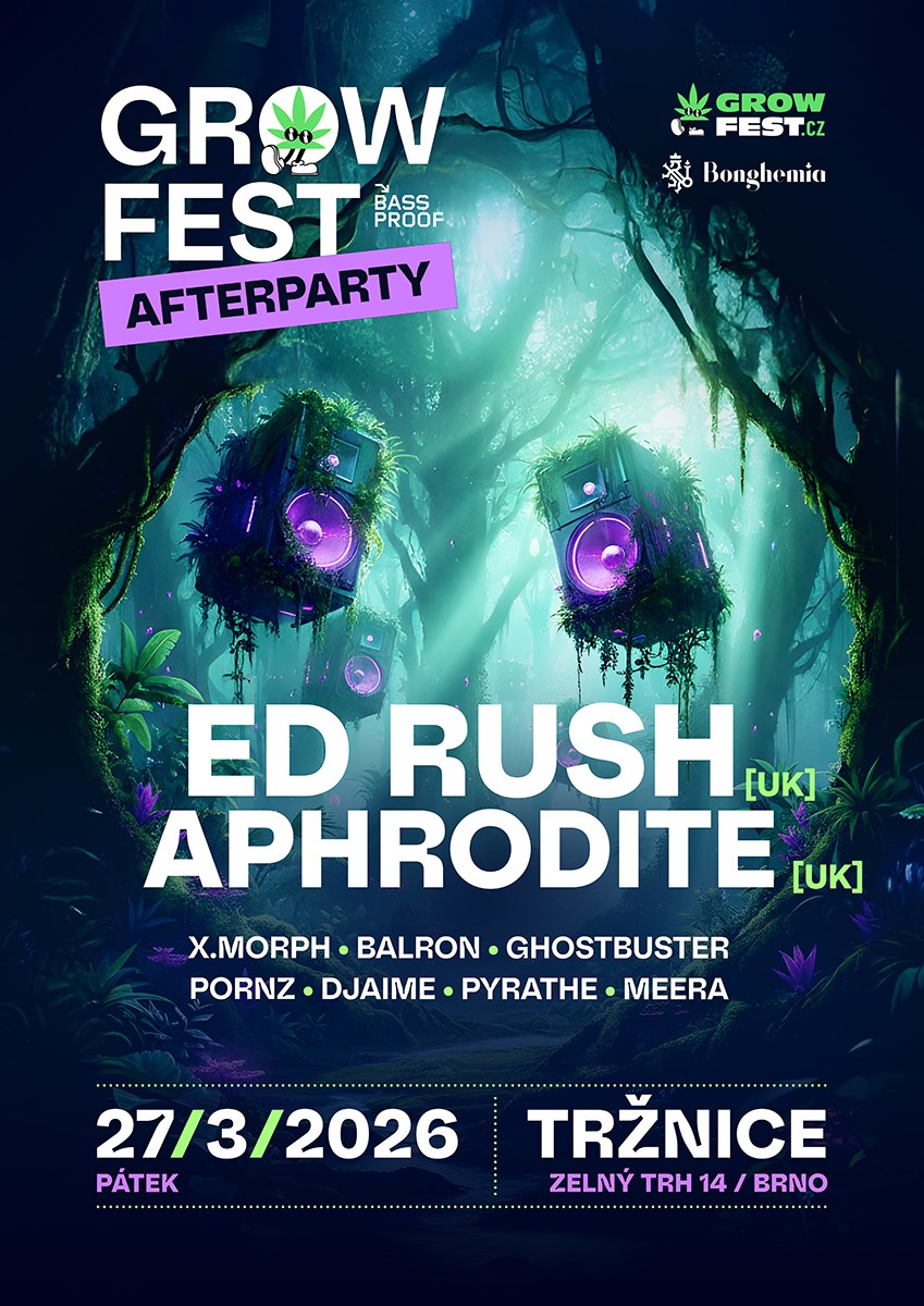 A je to tady! Představujeme vám drum & bassovou afterparty po Grow Fest, který se koná již potřetí, tradičně v termínu od 27. do 29. března 2026, nově na brněnském Výstavišti v Pavilon E.Afterparty se bude konat v pátek 27. 3. 2026 od 20:00 hodin a vstupné na tuto akci je ZDARMA první dvě hodiny, je však potřeba se registrovat na e-mailu bassproof@post.cz, kde ti sdělíme všechny potřebné informace.Připravili jsme pro tebe ten nejlepší drum & bassový program s těmi nejlepšími, které doplní místní matadoři a nové drum & bassové talenty. Těšit se můžeš na Ed Rush a Aphrodite, které doplní X.Morph, Balron, Ghostbustzer, Pornz, DJAIME a talentovaní Pyrathe a Meera.Nezapomeň, startujeme 27. 03. 2026 od 20:00 na brněnské Tržnici na Zelném trhu 14 v Brně. Pro registrované je vstupné první dvě hodiny ZDARMA, poté 150 Kč. Vstup na akci je pouze pro osoby starší 18 let. Pokud nás chceš podpořit a mít jistotu vstupu bez čekání, doporučujeme zakoupit lístek v předprodeji za 150 Kč.Pořadatel si vyhrazuje právo odmítnout vstup komukoli bez udání důvodu. Grow Fest Afterparty ED RUSH (UK) APHRODITE (UK) X.Morph Balron Ghostbuster Pornz DJaime Pyrathe MeeraVstup / Entry: Vstupné Zdarma - po 22:00 → 150 Kč #brno #drumandbass #dnb #dnbbrno #rave #neurofunk #party #čeko #slovensko #growfest