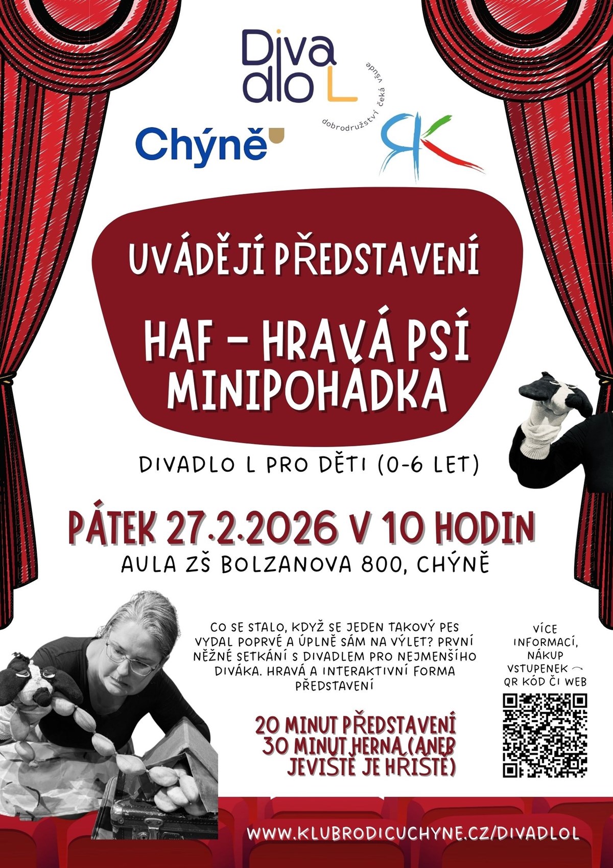 HAF hravá psí minipohádkaHravá psí minipohádka pro lidská mláďata od 0 roků do 6 let a jejich rodiče.Co se stalo, když se jeden takový pes vydal poprvé a úplně sám na výlet? První něžné setkání s divadlem pro nejmenšího diváka, které jim hravou a interaktivní formou vypráví o tom, že na dobrodružných výpravách je nejlepší, když se zase vrátíme domů, do bezpečí vlastního pelíšku.Po každém představení následuje psí hernička aneb Jeviště je hřiště.Během představení spolupracuje rodič a dítě v interakci s rozmanitými rekvizitami dotvářející celkový divadelní prožitek._________________________________________________________________Délka představení: 20 minut představení + 30 minut hernaZačátek v 10 hodin, pro děti 0-6 letAula bude pro veřejnost otevřena již 15 minut před představením.Komorní uspořádání na zemi na matracích. Volný pohyb dětí i konzumace během představení je samozřejmostí (zvláště u dětí 1-3 roky).