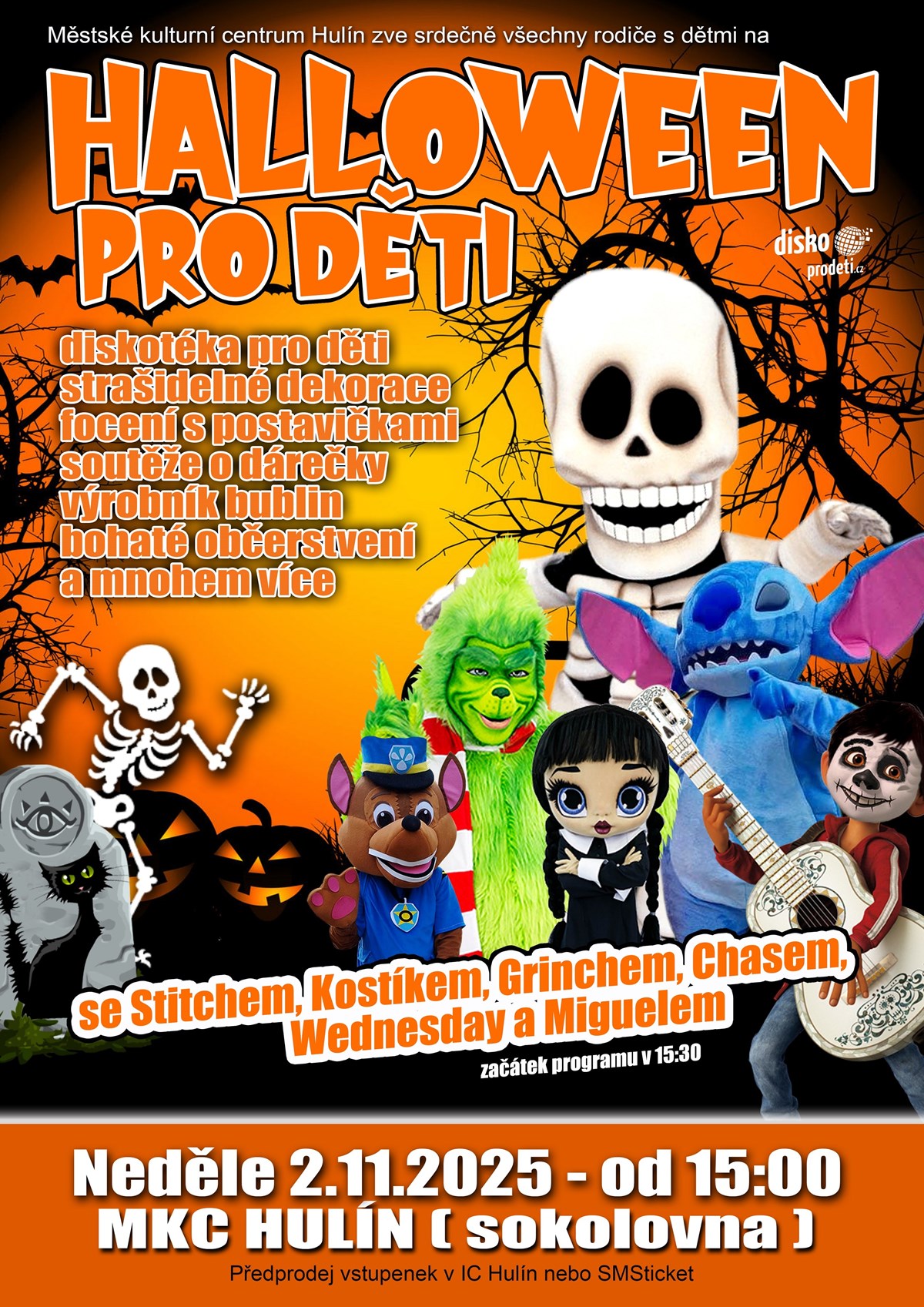 Městské kulturní centrum Hulín zve srdečně všechny rodiče s dětmi na HALLOWEEN PRO DĚTI. Párty se uskuteční 2. listopadu 2025 od 15:00 v sále MKC Hulín.Těšit se můžete na:diskotéka pro dětistrašidelné dekoracefocení s postavičkamisoutěže o dárečkyvýrobník bublinbohaté občerstvenía mnohem víceVzácní hosté: Stitch, Kostík, Grinch, Chase, Wednesday a Miguel.Začátek programu je v 15:30.Vstupenka stojí 150 Kč. Děti do 3 let zdarma.Těšíme se na Vás.