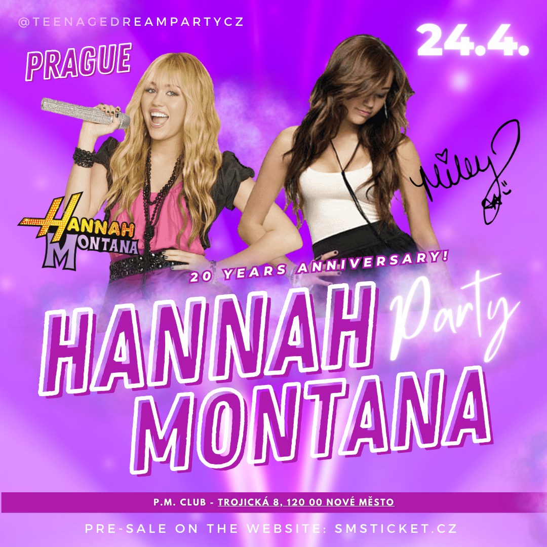 HANNAH MONTANA PARTY V PRAZE! Už 24.4. si přijď užít největší Hannah Montana Party v Evropě v rámci oslav 20 LET VYÝROČÍ OD PRVNÍHO DÍLU SERIÁLU HANNAH MONTANA!Přijď si užít jedinečný večer plný nostalgie, hudby a zábavy. Na místě bude probíhat SOUTĚŽ o hodnotné ceny s Miley a Hannah! Stačí si na akci zakoupit lístek do TOMBOLY! Celý večer se můžeš těšit na ty největší hity nejen ze všech sérií seriálu Hannah Montana z Disney Channelu, ale také na její sólové hity ze všech alb. Celý večer vás bude doprovázet nejen hudba, ale i videoklipy a záběry plné nostalgie, které budeme promítat na plátno za naším DJem. Klub bude otevřený od 20:00, ve 21:00 začínají Hannah/Miley songy s videoprojekcí. Určitě přijď včas! VIP vstupenka obsahuje přednostní vstup, VIP prostor s vlastním barem a záchody MŮŽEŠ SE TĚŠIT NA:- videoprojekci- SOUTĚŽ O CENY- tématickou výzdobu- světelné efekty- tematické drinky- skvělou atmosféru INFO:24.4.2026P.M. Club - Trojická 8, 120 00, Praha OPEN: 20:00START: 21:00Věk: 15+____________________________ ENGLISH: HANNAH MONTANA PARTY – FOR THE FIRST TIME IN PRAGUE!Come and enjoy the biggest Hannah Montana Party in Europe, celebrating the 20th anniversary of the very first episode of the Hannah Montana series!Get ready for a unique night full of nostalgia, music, and fun.Throughout the night, you can look forward to the biggest hits not only from all seasons of the Hannah Montana series on Disney Channel, but also her solo hits from all albums.The music will be accompanied by music videos and nostalgic footage projected onto the big screen behind our DJ.The club opens at 8:00 PM, with Hannah/Miley hits and video projections starting at 9:00 PM. Make sure to arrive on time!VIP tickets include priority entry, a VIP area with a private bar, and restrooms.YOU CAN LOOK FORWARD TO:- Video projections- Themed decorations- Light effects- Themed drinks- Amazing atmosphereEVENT INFO:24.4.2026P.M. Club – Trojická 8, 120 00, PragueOpen: 8:00 PMStart: 9:00 PMAge: 15+